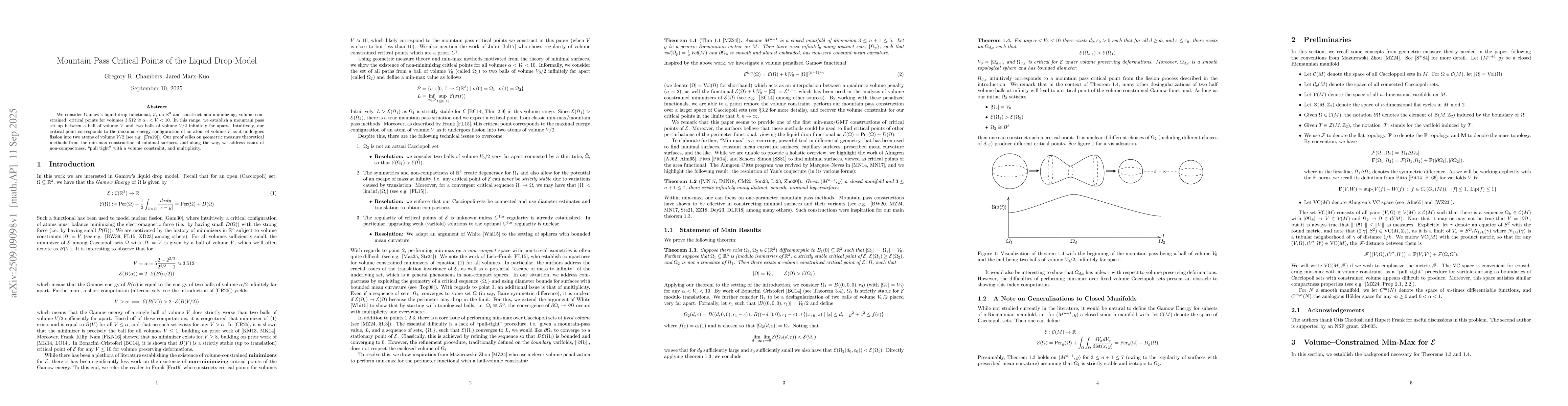 We consider Gamow's liquid drop functional, $\mathcal{E}$, on $\mathbb{R}^3$ and construct non-minimizing, volume constrained, critical points for volumes $3.512 \cong \alpha_0 < V < 10$. In this range, we establish a mountain pass set up between a ball of volume $V$ and two balls of volume $V/2$ infinitely far apart. Intuitively, our critical point corresponds to the maximal energy configuration of an atom of volume $V$ as it undergoes fission into two atoms of volume $V/2$. Our proof relies on geometric measure theoretical methods from the min-max construction of minimal surfaces, and along the way, we address issues of non-compactness, ``pull tight" with a volume constraint, and multiplicity.