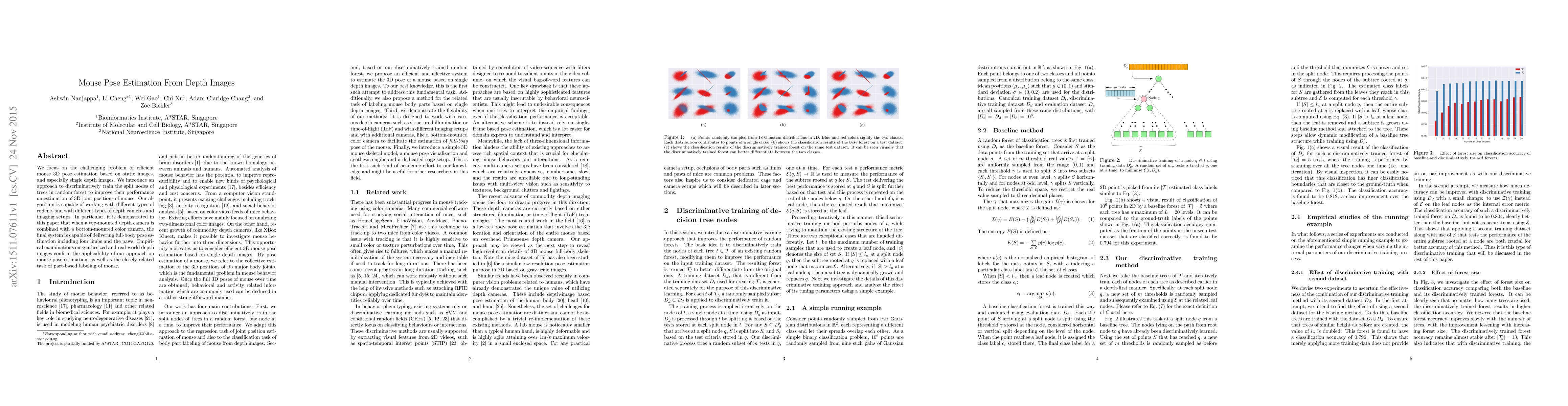 We focus on the challenging problem of efficient mouse 3D pose estimation based on static images, and especially single depth images. We introduce an approach to discriminatively train the split nodes of trees in random forest to improve their performance on estimation of 3D joint positions of mouse. Our algorithm is capable of working with different types of rodents and with different types of depth cameras and imaging setups. In particular, it is demonstrated in this paper that when a top-mounted depth camera is combined with a bottom-mounted color camera, the final system is capable of delivering full-body pose estimation including four limbs and the paws. Empirical examinations on synthesized and real-world depth images confirm the applicability of our approach on mouse pose estimation, as well as the closely related task of part-based labeling of mouse.