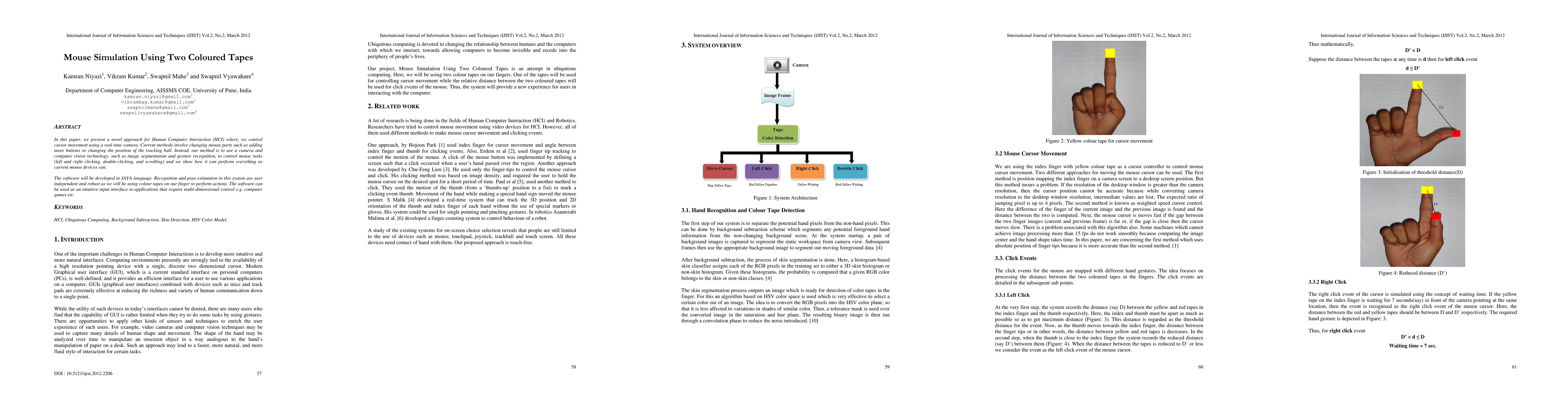 In this paper, we present a novel approach for Human Computer Interaction (HCI) where, we control cursor movement using a real-time camera. Current methods involve changing mouse parts such as adding more buttons or changing the position of the tracking ball. Instead, our method is to use a camera and computer vision technology, such as image segmentation and gesture recognition, to control mouse tasks (left and right clicking, double-clicking, and scrolling) and we show how it can perform everything as current mouse devices can. The software will be developed in JAVA language. Recognition and pose estimation in this system are user independent and robust as we will be using colour tapes on our finger to perform actions. The software can be used as an intuitive input interface to applications that require multi-dimensional control e.g. computer games etc.
