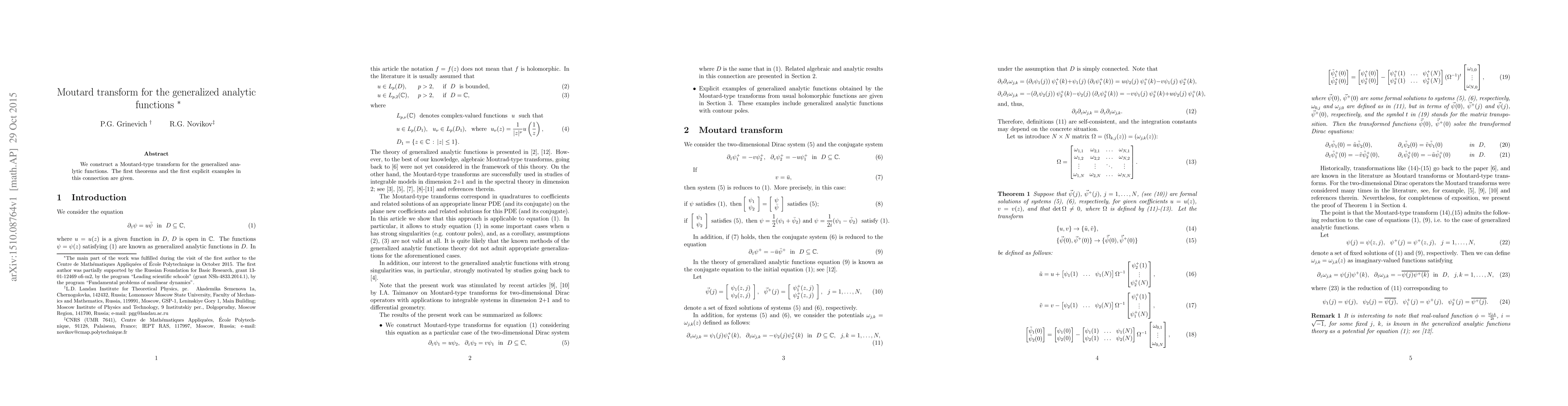 We construct a Moutard-type transform for the generalized analytic functions. The first theorems and the first explicit examples in this connection are given.