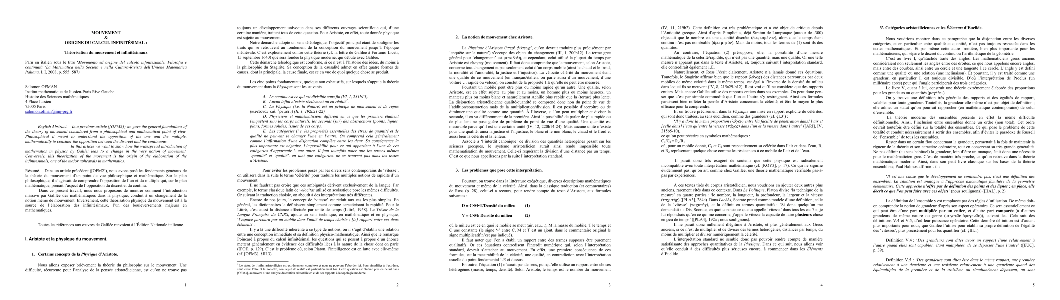 In a previous article we gave the general foundations of the theory of movement considered from a philosophical and mathematical point of view. Philosophical it meant to understand the opposition of the one and the multiple, mathematically to consider the opposition between the discreet and the continuous. In this article we want to show how the widespread introduction of mathematics in physics by Galilei leas to a change in the very notion of movement. Conversely, this theorization of the movement is the origin of the elaboration of the infinitesimals, one of the major upheavals in mathematics.