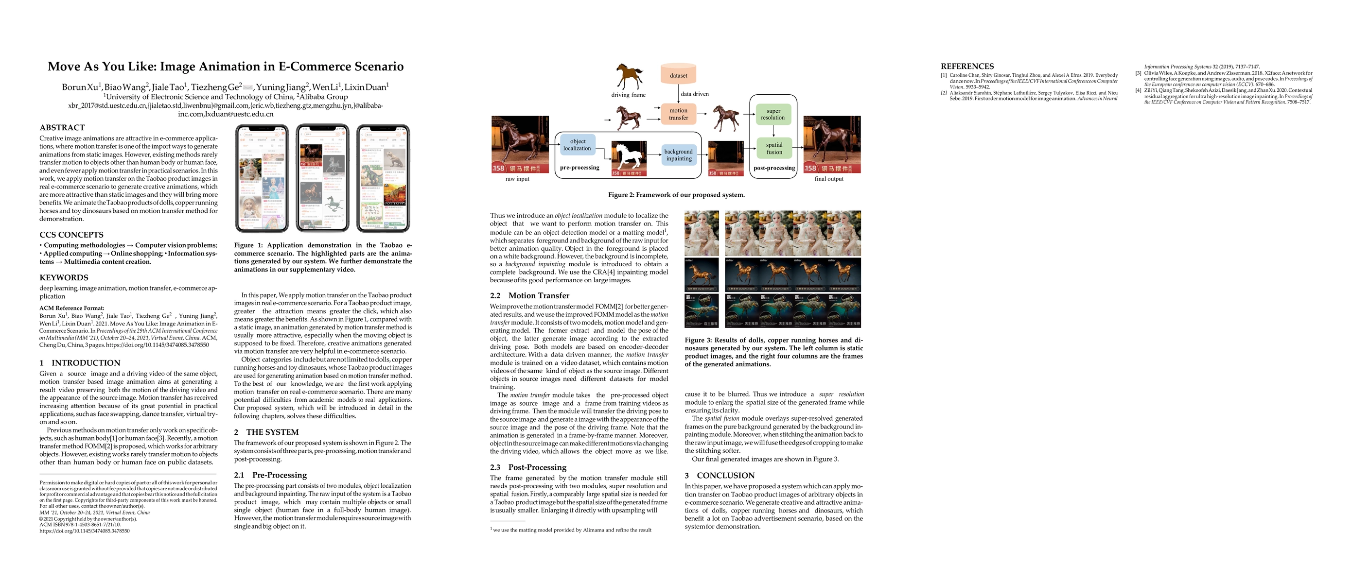 Creative image animations are attractive in e-commerce applications, where motion transfer is one of the import ways to generate animations from static images. However, existing methods rarely transfer motion to objects other than human body or human face, and even fewer apply motion transfer in practical scenarios. In this work, we apply motion transfer on the Taobao product images in real e-commerce scenario to generate creative animations, which are more attractive than static images and they will bring more benefits. We animate the Taobao products of dolls, copper running horses and toy dinosaurs based on motion transfer method for demonstration.