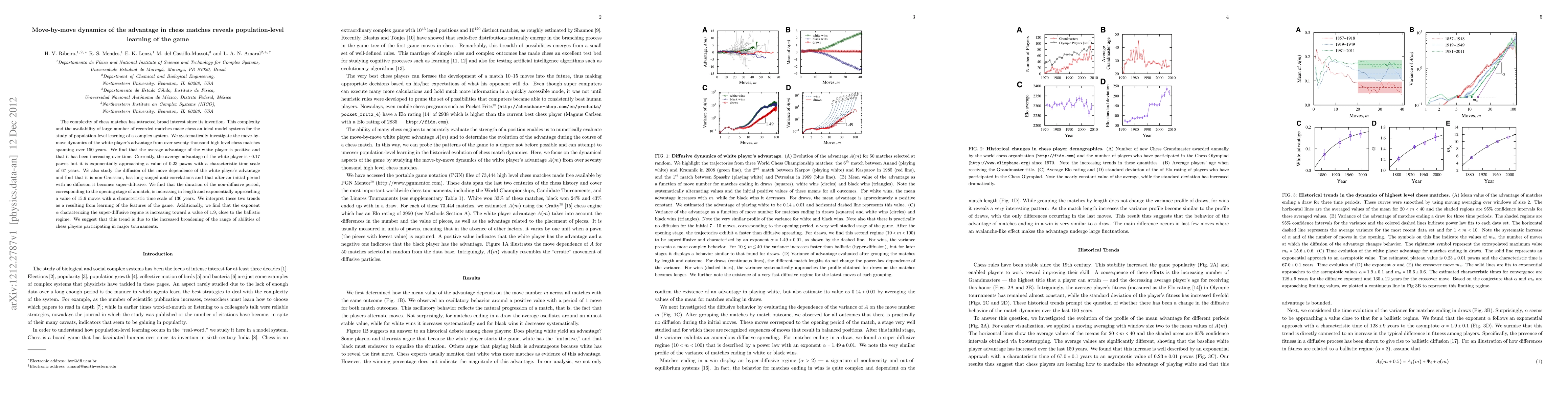 This study analyzes the move-by-move dynamics of the white player's advantage in over seventy thousand high-level chess matches, revealing an increasing average advantage over time and suggesting population-level learning trends, including a lengthening non-diffusive period and a shift towards a more ballistic diffusive regime.