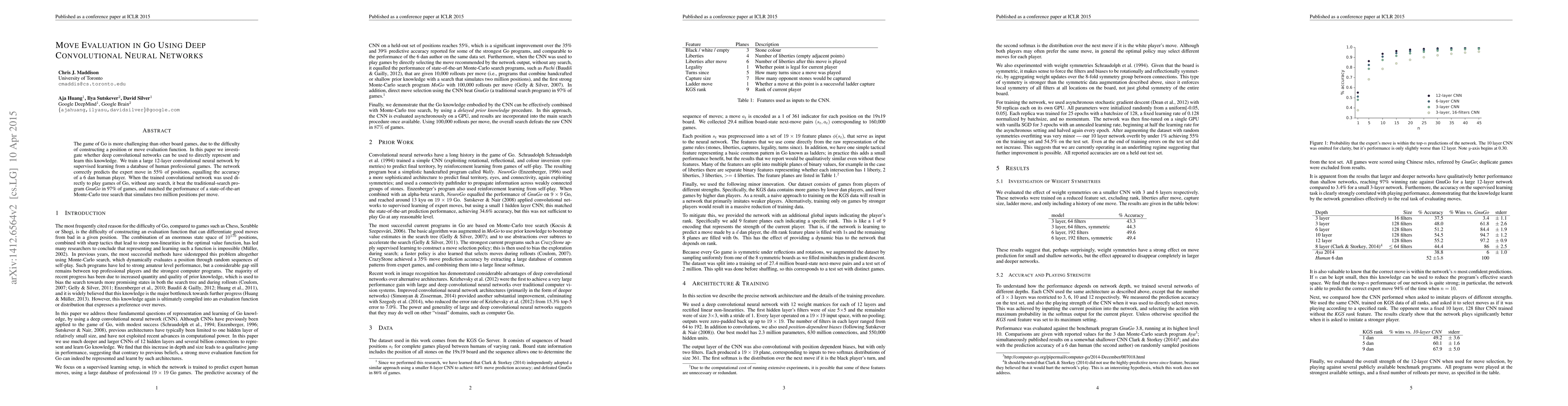 This paper explores the use of deep convolutional neural networks to evaluate moves in Go, achieving a 55% accuracy in predicting expert moves and outperforming traditional search programs when playing without search. The network matches the performance of advanced Monte-Carlo tree search methods.