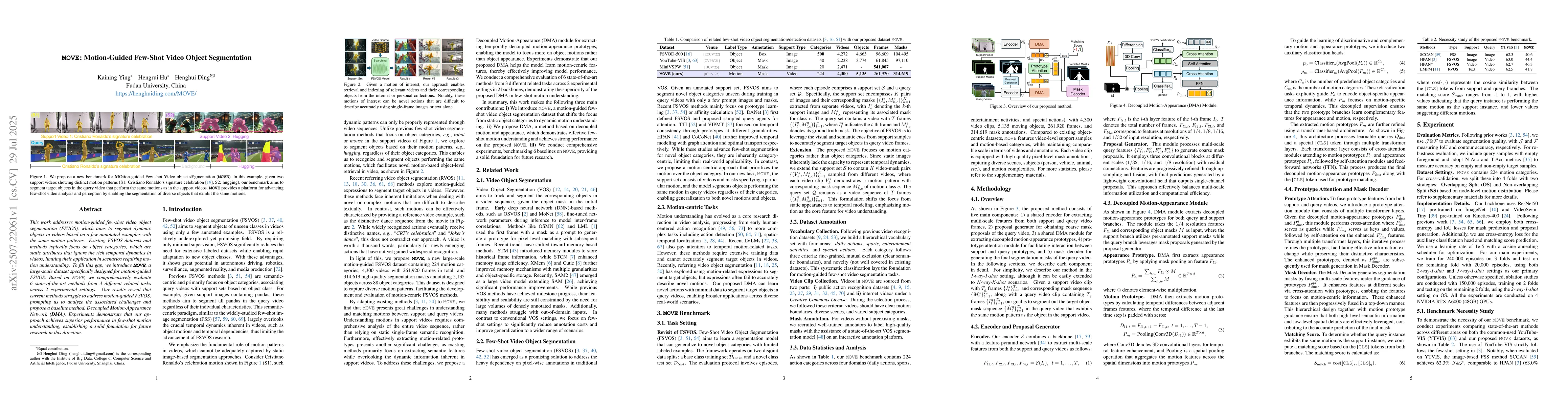 The paper introduces MOVE, a large-scale dataset for motion-guided few-shot video object segmentation (FSVOS). It evaluates six state-of-the-art methods across two experimental settings, identifying challenges and proposing a baseline method, the Decoupled Motion Appearance Network (DMA).