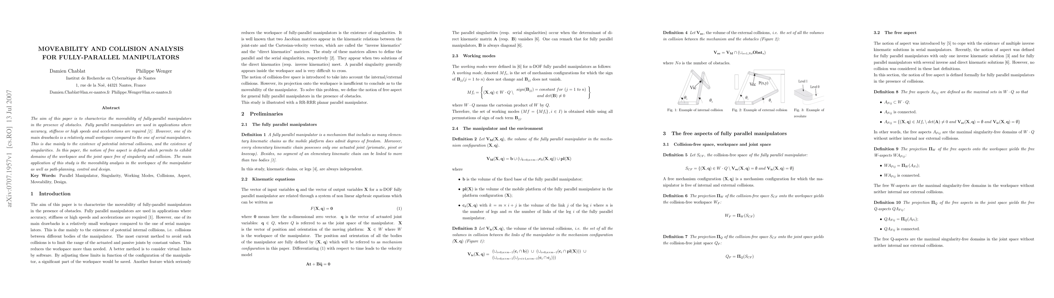 This paper characterizes the moveability of fully-parallel manipulators by defining the "free aspect" to identify workspace domains free of singularities and collisions. The study aims to enhance path-planning, control, and design for applications requiring high accuracy and speed.