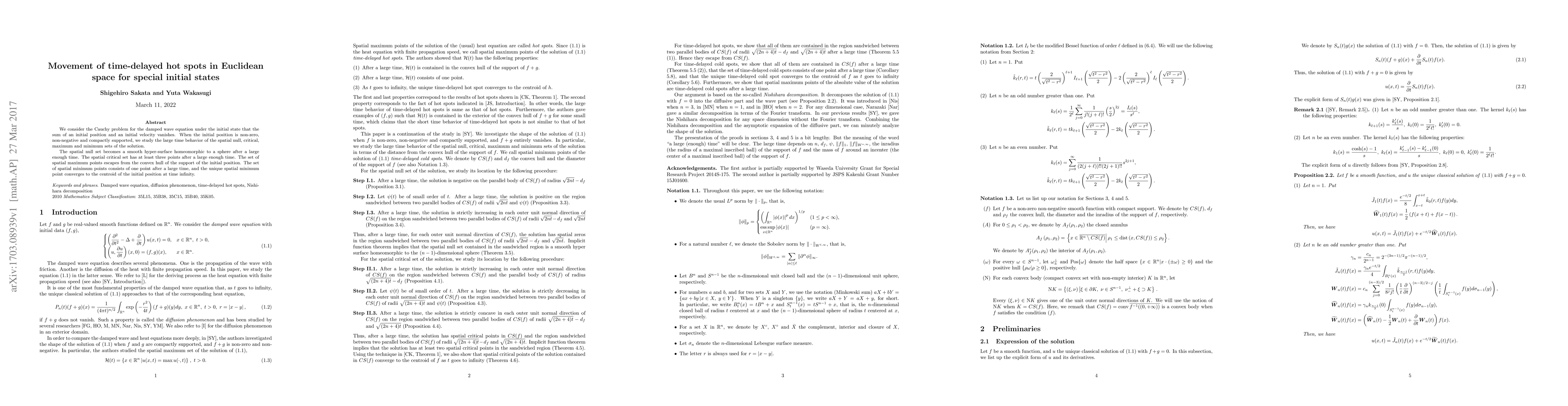 We consider the Cauchy problem for the damped wave equation under the initial state that the sum of an initial position and an initial velocity vanishes. When the initial position is non-zero, non-negative and compactly supported, we study the large time behavior of the spatial null, critical, maximum and minimum sets of the solution. The spatial null set becomes a smooth hyper-surface homeomorphic to a sphere after a large enough time. The spatial critical set has at least three points after a large enough time. The set of spatial maximum points escapes from the convex hull of the support of the initial position. The set of spatial minimum points consists of one point after a large time, and the unique spatial minimum point converges to the centroid of the initial position at time infinity.