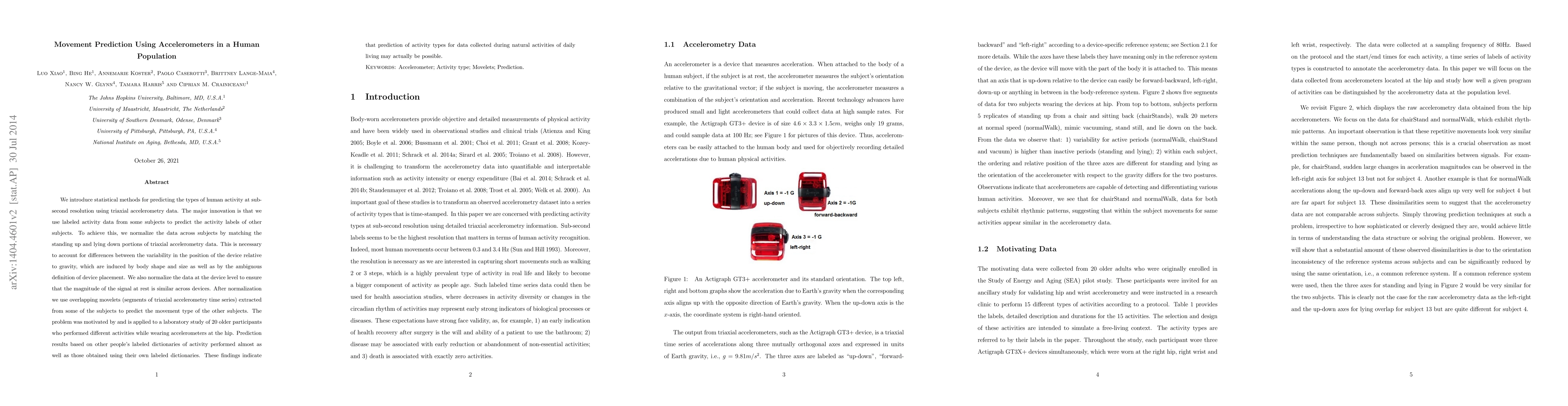 We introduce statistical methods for predicting the types of human activity at sub-second resolution using triaxial accelerometry data. The major innovation is that we use labeled activity data from some subjects to predict the activity labels of other subjects. To achieve this, we normalize the data across subjects by matching the standing up and lying down portions of triaxial accelerometry data. This is necessary to account for differences between the variability in the position of the device relative to gravity, which are induced by body shape and size as well as by the ambiguous definition of device placement. We also normalize the data at the device level to ensure that the magnitude of the signal at rest is similar across devices. After normalization we use overlapping movelets (segments of triaxial accelerometry time series) extracted from some of the subjects to predict the movement type of the other subjects. The problem was motivated by and is applied to a laboratory study of 20 older participants who performed different activities while wearing accelerometers at the hip. Prediction results based on other people's labeled dictionaries of activity performed almost as well as those obtained using their own labeled dictionaries. These findings indicate that prediction of activity types for data collected during natural activities of daily living may actually be possible.