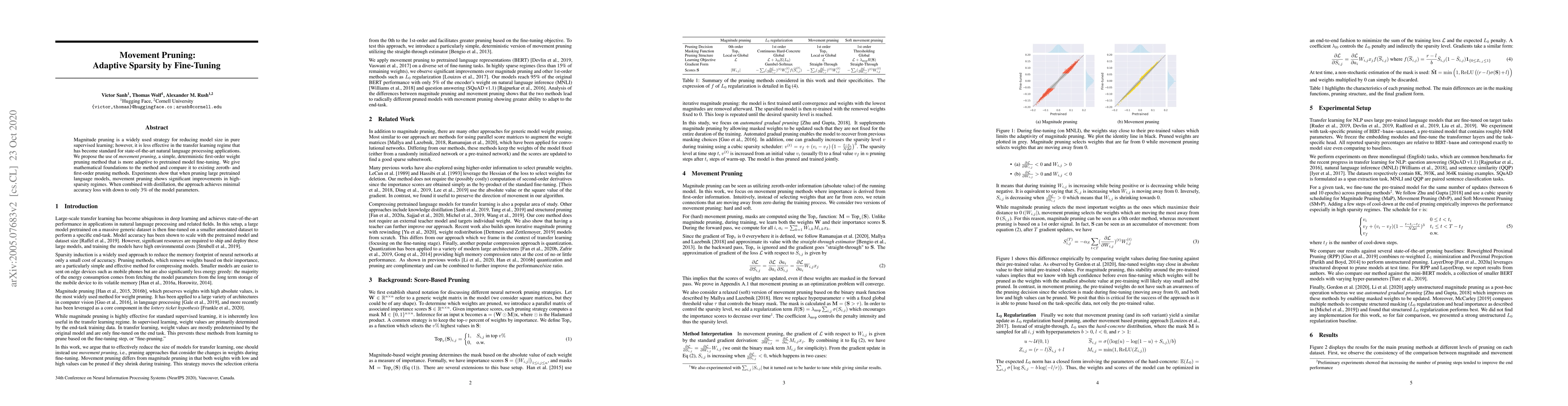 Title: Movement Pruning: Adaptive Sparsity by Fine-Tuning Summary: This paper introduces movement pruning, a deterministic first-order weight pruning method that enhances the efficiency of pretrained model fine-tuning, achieving significant improvements in accuracy even at high sparsity levels, and minimal loss when combined with distillation.