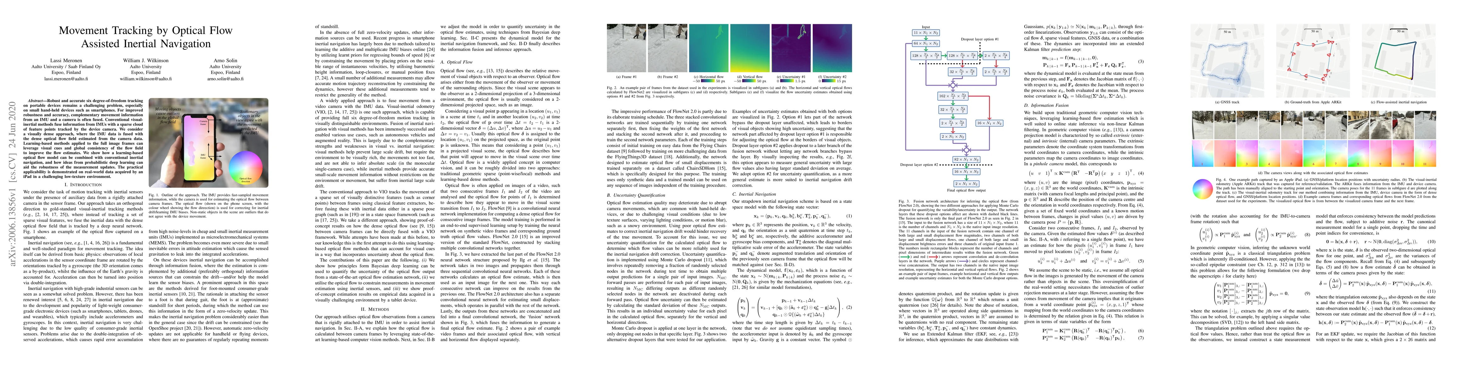 This paper proposes a method for robust six-degree-of-freedom tracking on portable devices by fusing inertial measurement unit (IMU) data with dense optical flow estimated from camera images. It demonstrates improved tracking accuracy and robustness using a learning-based optical flow model combined with conventional inertial navigation techniques.