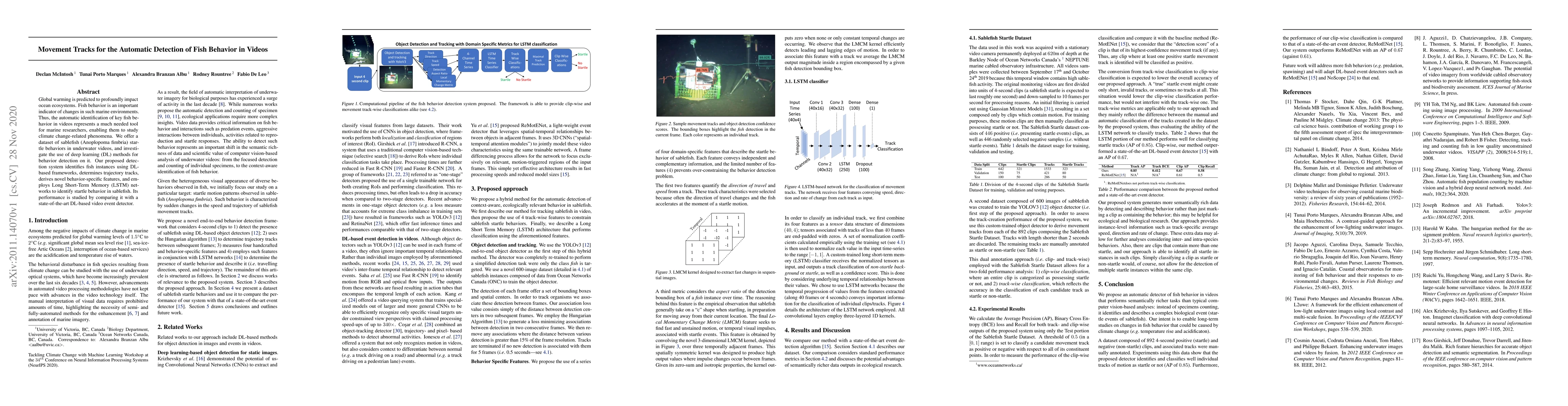 Global warming is predicted to profoundly impact ocean ecosystems. Fish behavior is an important indicator of changes in such marine environments. Thus, the automatic identification of key fish behavior in videos represents a much needed tool for marine researchers, enabling them to study climate change-related phenomena. We offer a dataset of sablefish (Anoplopoma fimbria) startle behaviors in underwater videos, and investigate the use of deep learning (DL) methods for behavior detection on it. Our proposed detection system identifies fish instances using DL-based frameworks, determines trajectory tracks, derives novel behavior-specific features, and employs Long Short-Term Memory (LSTM) networks to identify startle behavior in sablefish. Its performance is studied by comparing it with a state-of-the-art DL-based video event detector.