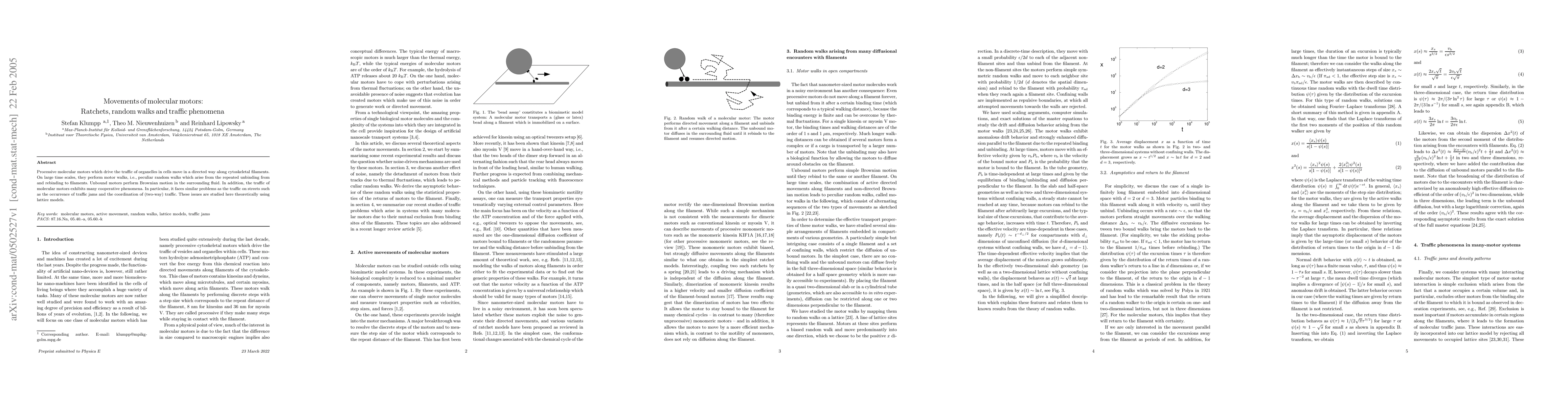 Molecular motors moving along cytoskeletal filaments exhibit random walks with cooperative phenomena, including traffic jams, similar to urban traffic, which can be studied using lattice models.