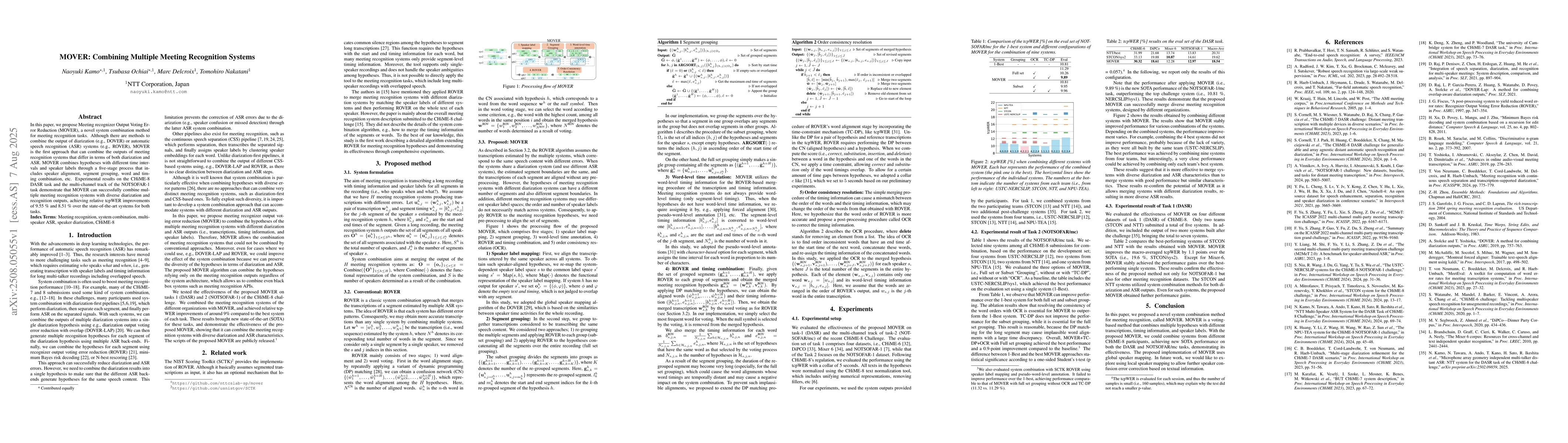 In this paper, we propose Meeting recognizer Output Voting Error Reduction (MOVER), a novel system combination method for meeting recognition tasks. Although there are methods to combine the output of diarization (e.g., DOVER) or automatic speech recognition (ASR) systems (e.g., ROVER), MOVER is the first approach that can combine the outputs of meeting recognition systems that differ in terms of both diarization and ASR. MOVER combines hypotheses with different time intervals and speaker labels through a five-stage process that includes speaker alignment, segment grouping, word and timing combination, etc. Experimental results on the CHiME-8 DASR task and the multi-channel track of the NOTSOFAR-1 task demonstrate that MOVER can successfully combine multiple meeting recognition systems with diverse diarization and recognition outputs, achieving relative tcpWER improvements of 9.55 % and 8.51 % over the state-of-the-art systems for both tasks.