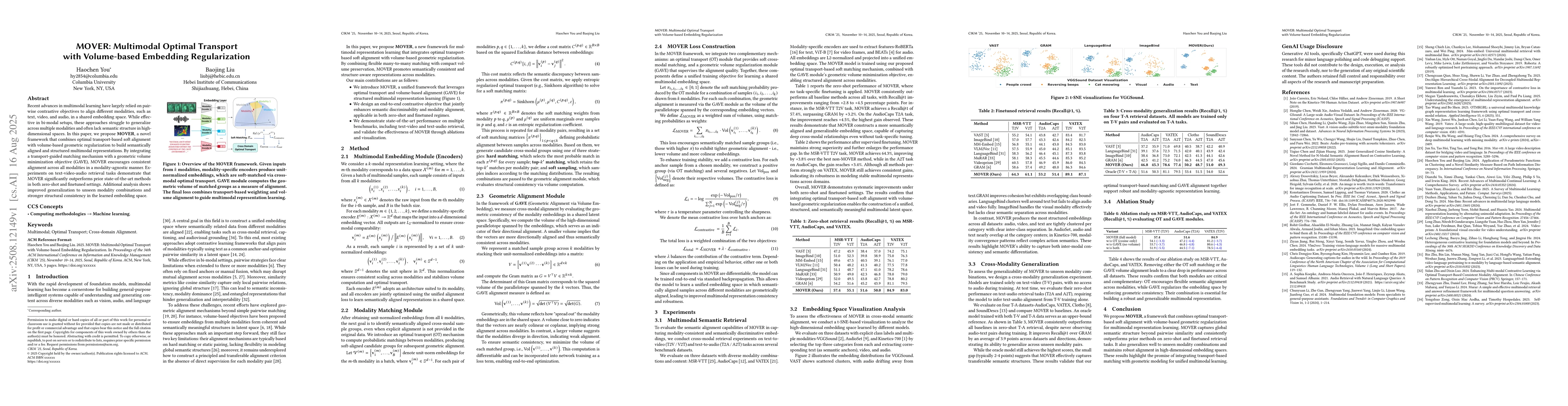 Recent advances in multimodal learning have largely relied on pairwise contrastive objectives to align different modalities, such as text, video, and audio, in a shared embedding space. While effective in bi-modal setups, these approaches struggle to generalize across multiple modalities and often lack semantic structure in high-dimensional spaces. In this paper, we propose MOVER, a novel framework that combines optimal transport-based soft alignment with volume-based geometric regularization to build semantically aligned and structured multimodal representations. By integrating a transport-guided matching mechanism with a geometric volume minimization objective (GAVE), MOVER encourages consistent alignment across all modalities in a modality-agnostic manner. Experiments on text-video-audio retrieval tasks demonstrate that MOVER significantly outperforms prior state-of-the-art methods in both zero-shot and finetuned settings. Additional analysis shows improved generalization to unseen modality combinations and stronger structural consistency in the learned embedding space.