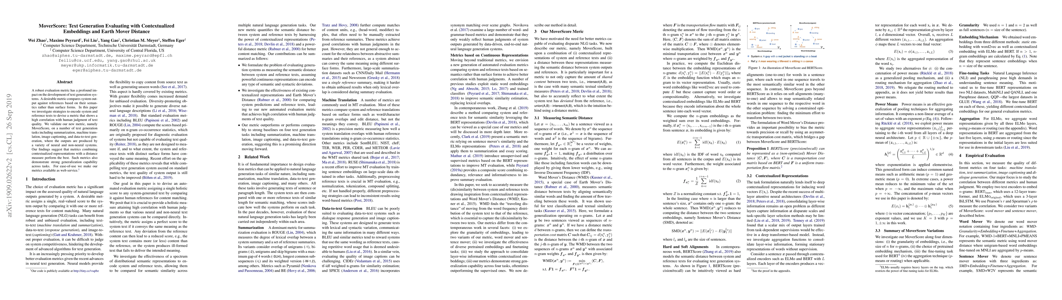 Researchers developed a new metric called MoverScore that evaluates text generation systems based on semantic meaning, achieving high correlation with human judgment of quality across various tasks. The findings suggest that combining contextualized embeddings with distance measures is key to robust evaluation metrics.