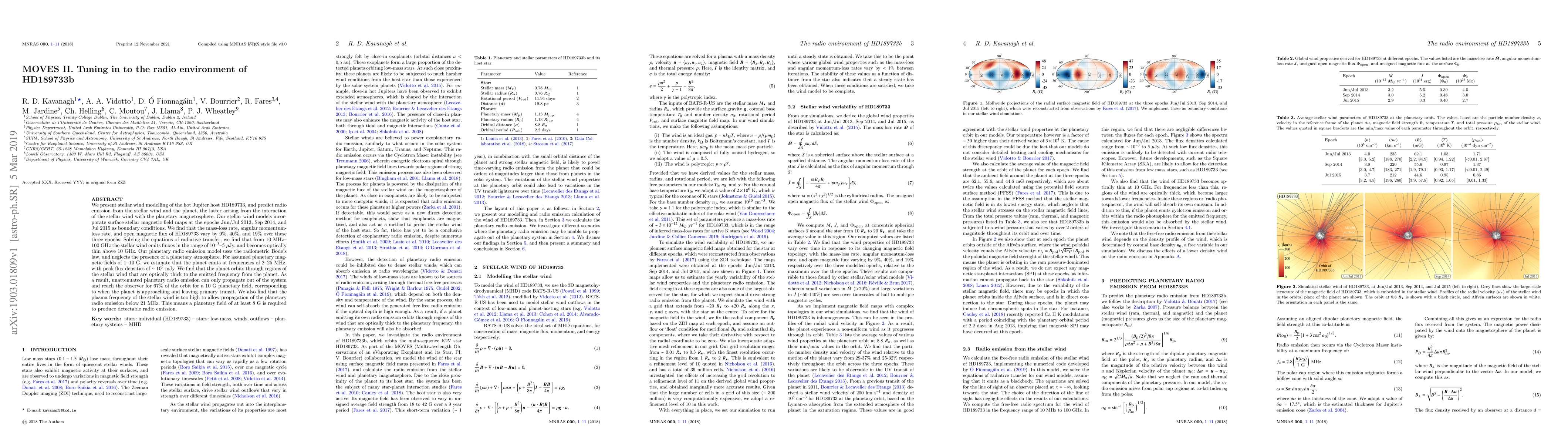 We present stellar wind modelling of the hot Jupiter host HD189733, and predict radio emission from the stellar wind and the planet, the latter arising from the interaction of the stellar wind with the planetary magnetosphere. Our stellar wind models incorporate surface stellar magnetic field maps at the epochs Jun/Jul 2013, Sep 2014, and Jul 2015 as boundary conditions. We find that the mass-loss rate, angular momentum-loss rate, and open magnetic flux of HD189733 vary by 9%, 40%, and 19% over these three epochs. Solving the equations of radiative transfer, we find that from 10 MHz-100 GHz the stellar wind emits fluxes in the range of $10^{-3}$-$5$ $\mu$Jy, and becomes optically thin above 10 GHz. Our planetary radio emission model uses the radiometric Bode's law, and neglects the presence of a planetary atmosphere. For assumed planetary magnetic fields of 1-10 G, we estimate that the planet emits at frequencies of 2-25 MHz, with peak flux densities of $\sim10^2$ mJy. We find that the planet orbits through regions of the stellar wind that are optically thick to the emitted frequency from the planet. As a result, unattenuated planetary radio emission can only propagate out of the system and reach the observer for 67% of the orbit for a 10 G planetary field, corresponding to when the planet is approaching and leaving primary transit. We also find that the plasma frequency of the stellar wind is too high to allow propagation of the planetary radio emission below 21 MHz. This means a planetary field of at least 8 G is required to produce detectable radio emission.