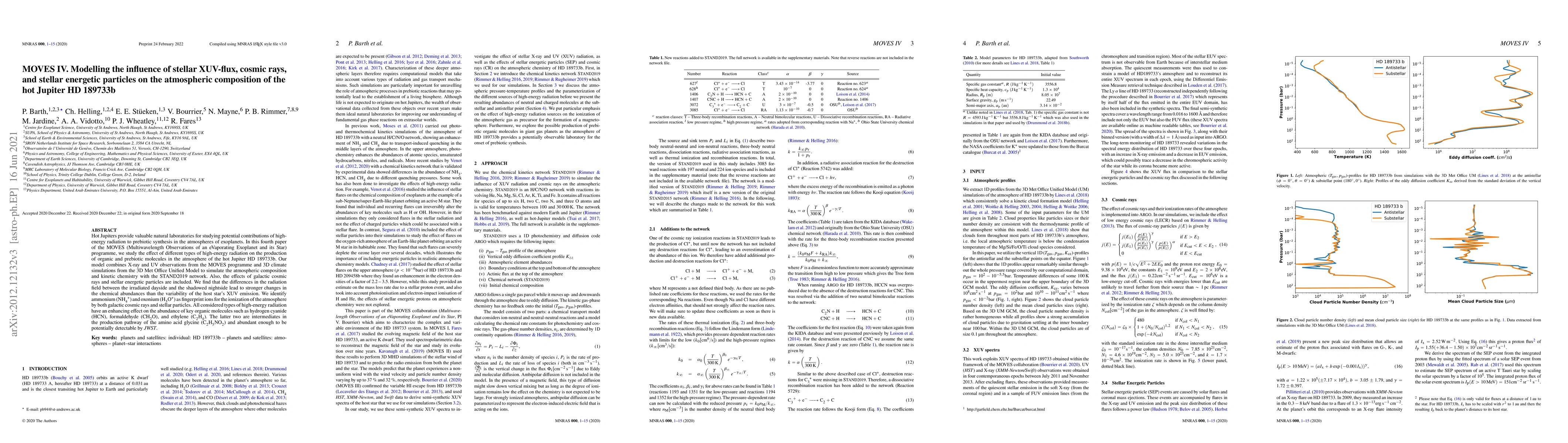Hot Jupiters provide valuable natural laboratories for studying potential contributions of high-energy radiation to prebiotic synthesis in the atmospheres of exoplanets. In this fourth paper of the MOVES (Multiwavelength Observations of an eVaporating Exoplanet and its Star) programme, we study the effect of different types of high-energy radiation on the production of organic and prebiotic molecules in the atmosphere of the hot Jupiter HD 189733b. Our model combines X-ray and UV observations from the MOVES programme and 3D climate simulations from the 3D Met Office Unified Model to simulate the atmospheric composition and kinetic chemistry with the STAND2019 network. Also, the effects of galactic cosmic rays and stellar energetic particles are included. We find that the differences in the radiation field between the irradiated dayside and the shadowed nightside lead to stronger changes in the chemical abundances than the variability of the host star's XUV emission. We identify ammonium (NH4+) and oxonium (H3O+) as fingerprint ions for the ionization of the atmosphere by both galactic cosmic rays and stellar particles. All considered types of high-energy radiation have an enhancing effect on the abundance of key organic molecules such as hydrogen cyanide (HCN), formaldehyde (CH2O), and ethylene (C2H4). The latter two are intermediates in the production pathway of the amino acid glycine (C2H5NO2) and abundant enough to be potentially detectable by JWST.