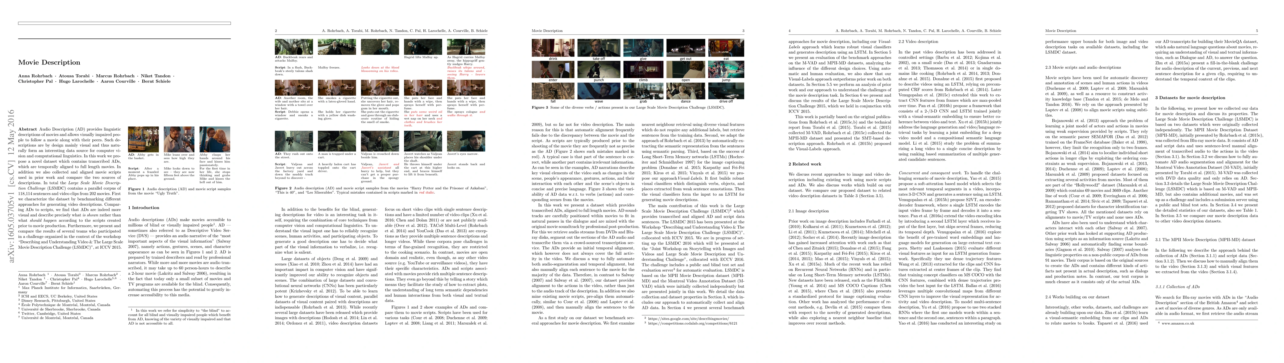 This paper introduces a novel dataset of Audio Descriptions (ADs) for movies, which provides linguistic descriptions for visually impaired viewers, and compares it to traditional movie scripts. The dataset, LSMDC, contains 118,114 sentences and video clips from 202 movies, and shows that ADs are more visual and aligned with actual movie scenes compared to pre-production scripts.