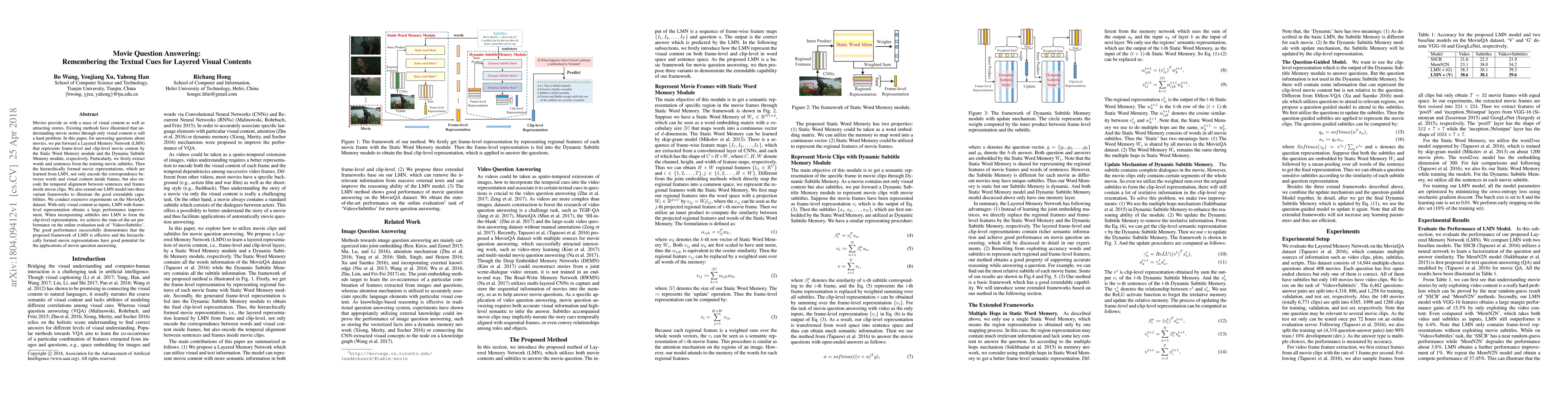 This paper proposes a Layered Memory Network (LMN) to improve movie question answering by encoding both frame-level visual content and clip-level textual cues from subtitles. The LMN achieves state-of-the-art results on the MovieQA dataset, demonstrating the effectiveness of integrating visual and textual information for better understanding of movie stories.