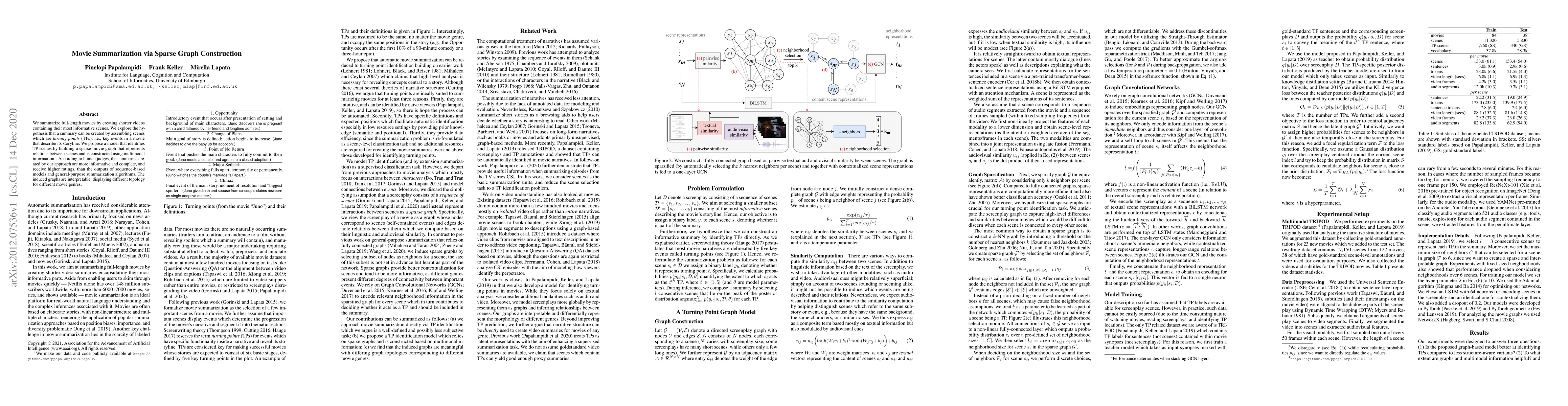 This paper proposes a method for movie summarization by identifying key turning point scenes using a sparse graph constructed from multimodal scene relations, which results in more informative and complete summaries compared to traditional sequence-based models and general-purpose algorithms, with genre-specific graph topologies.