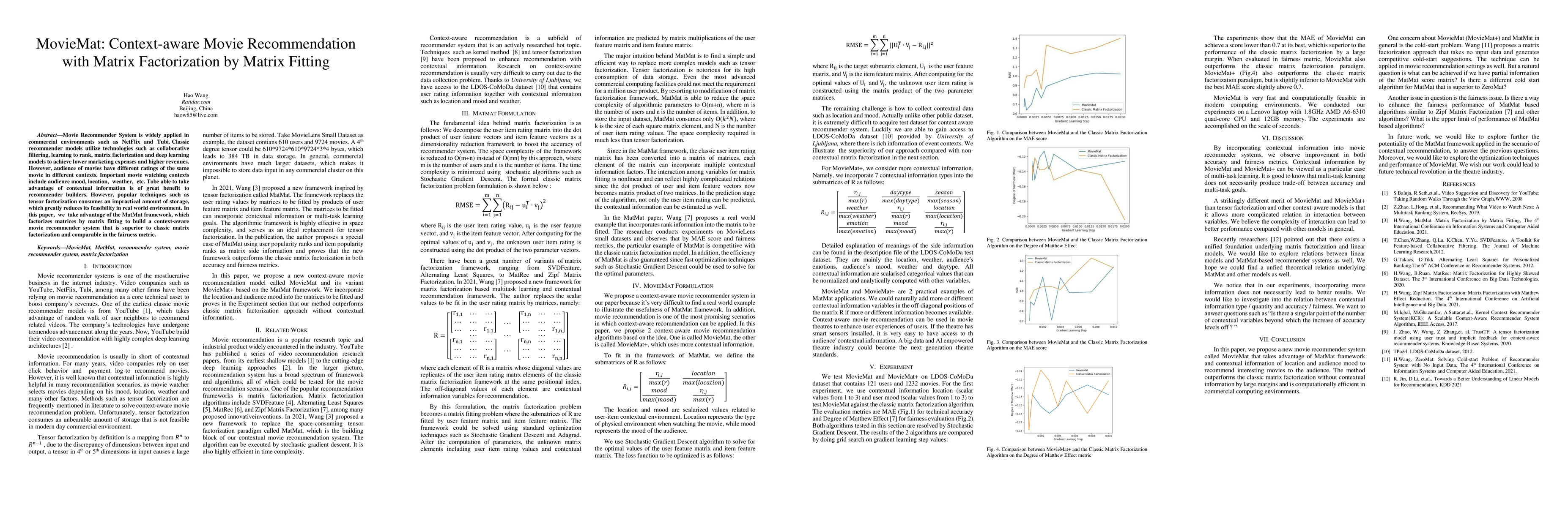 Movie Recommender System is widely applied in commercial environments such as NetFlix and Tubi. Classic recommender models utilize technologies such as collaborative filtering, learning to rank, matrix factorization and deep learning models to achieve lower marketing expenses and higher revenues. However, audience of movies have different ratings of the same movie in different contexts. Important movie watching contexts include audience mood, location, weather, etc. Tobe able to take advantage of contextual information is of great benefit to recommender builders. However, popular techniques such as tensor factorization consumes an impractical amount of storage, which greatly reduces its feasibility in real world environment. In this paper, we take advantage of the MatMat framework, which factorizes matrices by matrix fitting to build a context-aware movie recommender system that is superior to classic matrix factorization and comparable in the fairness metric.