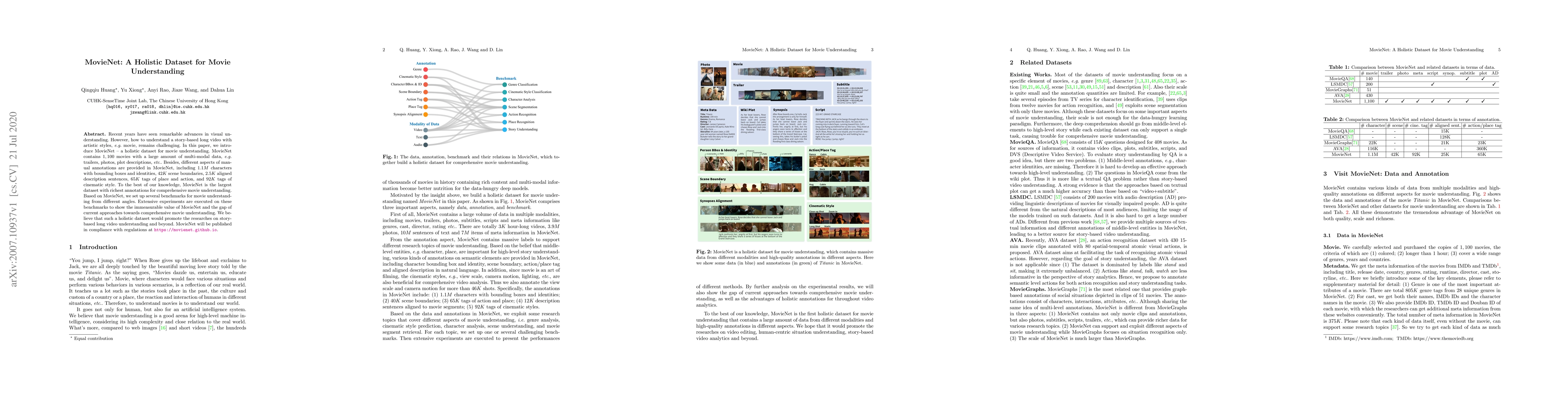 MovieNet is a comprehensive dataset for movie understanding, featuring 1,100 movies with extensive multi-modal data and detailed annotations, including character identities, scene boundaries, and cinematic styles. The dataset aims to advance research in story-based long video understanding.