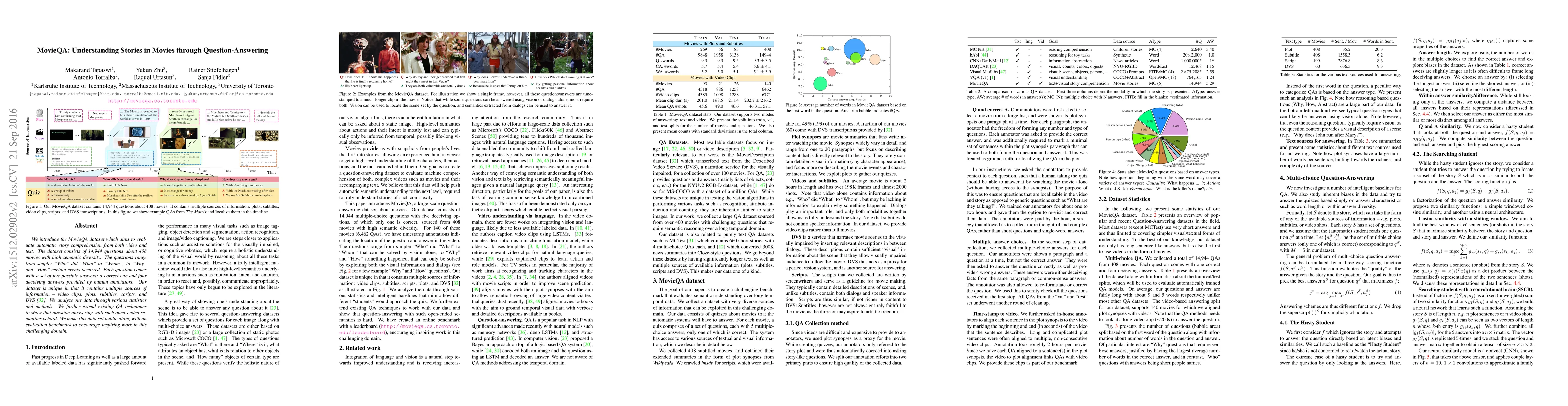 We introduce the MovieQA dataset which aims to evaluate automatic story comprehension from both video and text. The dataset consists of 14,944 questions about 408 movies with high semantic diversity. The questions range from simpler "Who" did "What" to "Whom", to "Why" and "How" certain events occurred. Each question comes with a set of five possible answers; a correct one and four deceiving answers provided by human annotators. Our dataset is unique in that it contains multiple sources of information -- video clips, plots, subtitles, scripts, and DVS. We analyze our data through various statistics and methods. We further extend existing QA techniques to show that question-answering with such open-ended semantics is hard. We make this data set public along with an evaluation benchmark to encourage inspiring work in this challenging domain.