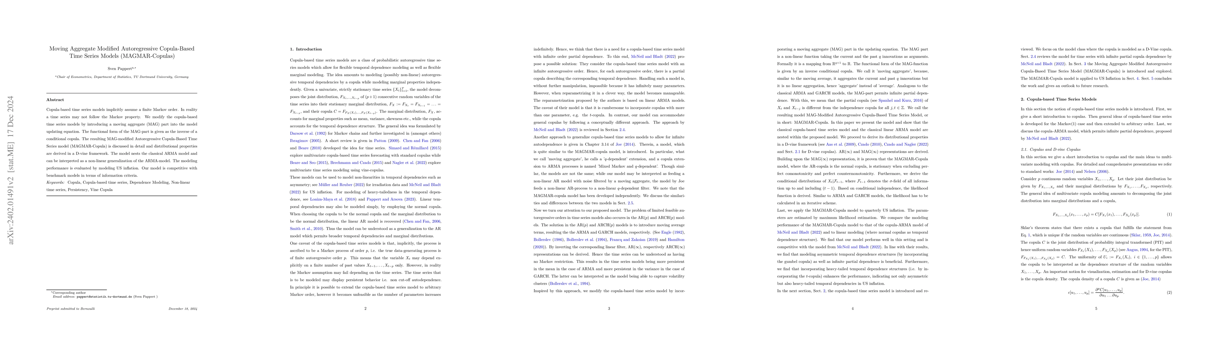 This paper proposes a MAGMAR-Copula model, a modified autoregressive copula-based time series model without Markov restriction, integrating a moving aggregate part to better capture non-Markovian time series behavior. The model's performance is competitive compared to existing models, as demonstrated through an application to US inflation data.