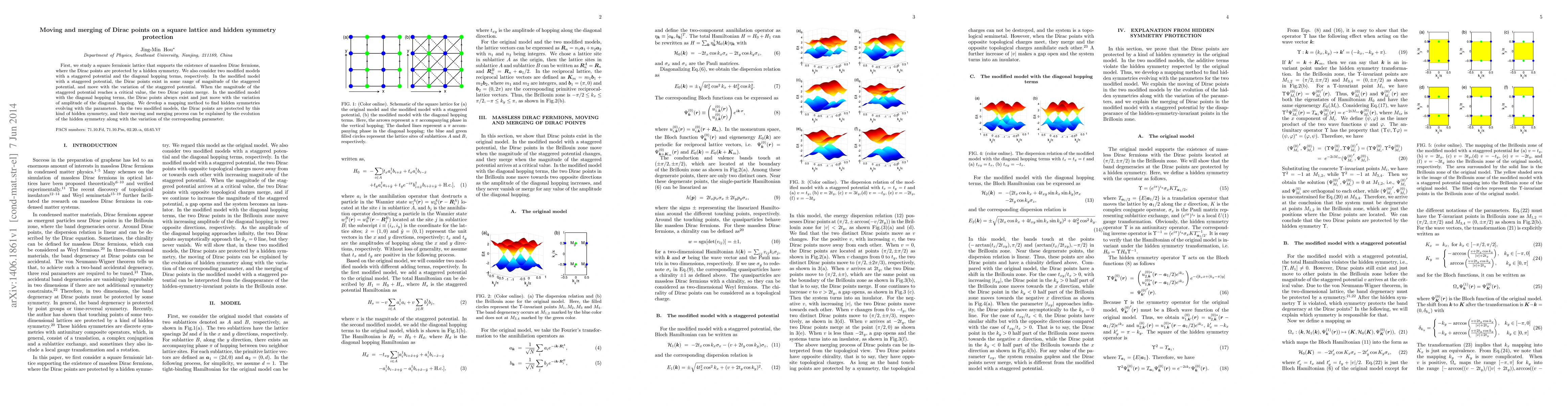 This paper investigates the behavior of Dirac points on a square lattice with massless fermions, focusing on their protection by hidden symmetries. It explores two modified models where Dirac points move and merge under varying potentials, revealing the underlying symmetry that governs these phenomena.