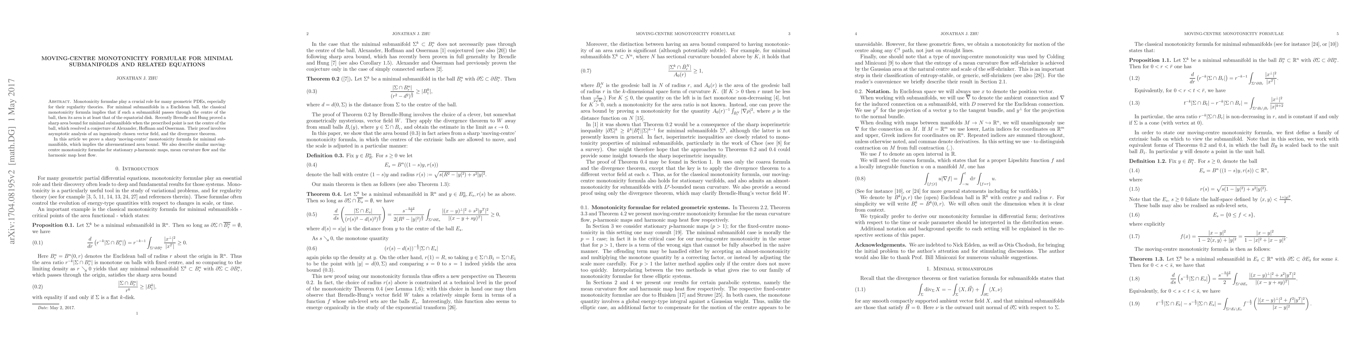 Monotonicity formulae play a crucial role for many geometric PDEs, especially for their regularity theories. For minimal submanifolds in a Euclidean ball, the classical monotonicity formula implies that if such a submanifold passes through the centre of the ball, then its area is at least that of the equatorial disk. Recently Brendle and Hung proved a sharp area bound for minimal submanifolds when the prescribed point is not the centre of the ball, which resolved a conjecture of Alexander, Hoffman and Osserman. Their proof involves asymptotic analysis of an ingeniously chosen vector field, and the divergence theorem. In this article we prove a sharp `moving-centre' monotonicity formula for minimal submanifolds, which implies the aforementioned area bound. We also describe similar moving-centre monotonicity formulae for stationary $p$-harmonic maps, mean curvature flow and the harmonic map heat flow.
