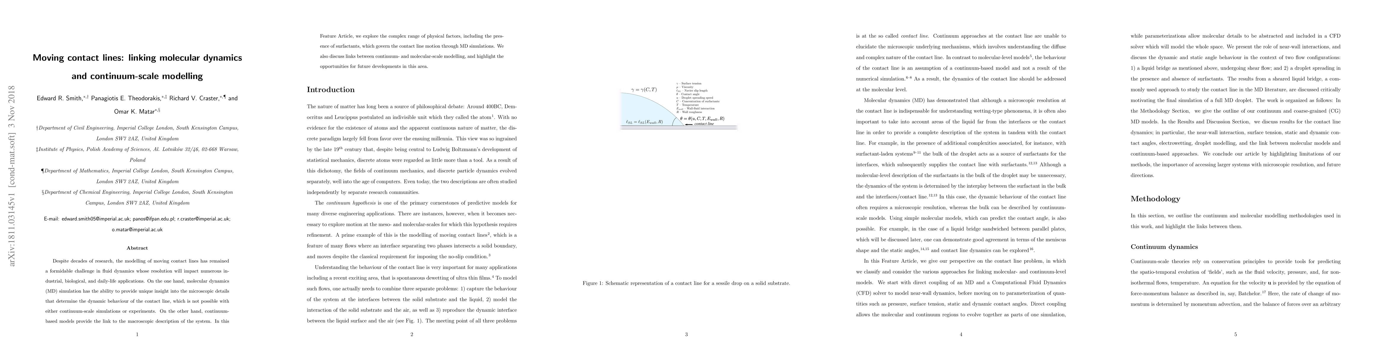 This research stands out by systematically exploring the various contributions to moving contact lines, from slip-length to surface tension, static contact angle behavior, and contact line dynamics, and proposing methods to couple molecular models with continuum simulations.