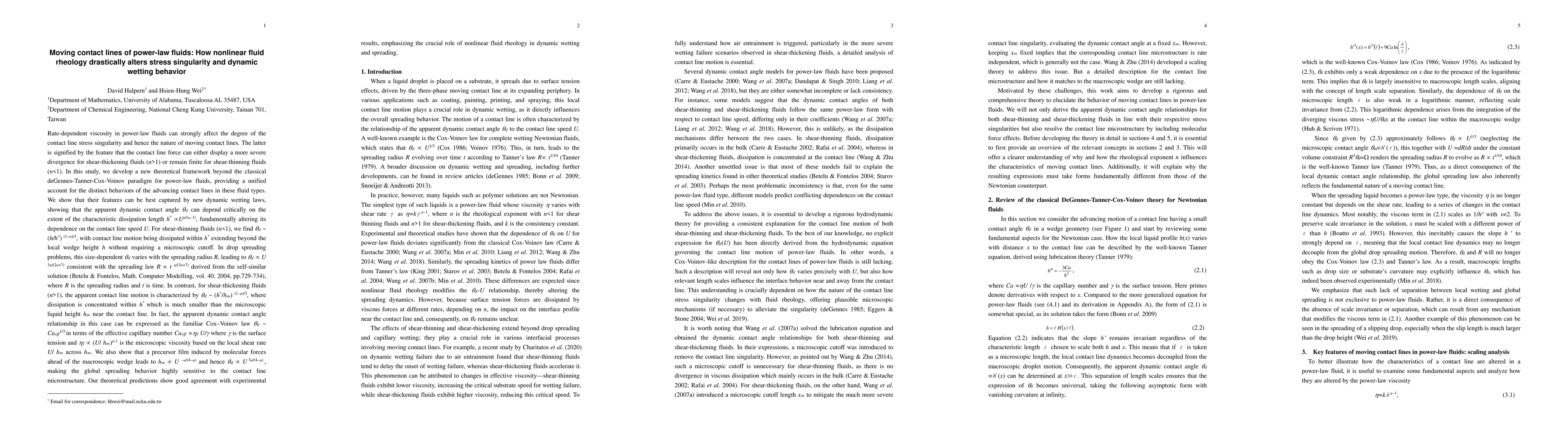 Power-law fluids can strongly affect the degree of the contact line stress singularity and hence the nature of moving contact lines. We develop a framework beyond the classical paradigm for power-law fluids, providing a unified account for the distinct behaviors of the advancing contact lines. We show that the apparent dynamic contact angle $\theta_d$ can depend on the extent of the characteristic dissipation length $h^* \propto U_n/(n-1)$, altering its dependence on the contact line speed $U$. For shear-thinning fluids, we find $\theta_d \sim (h/h^*)^{(1-n)/3}$, with contact line motion being dissipated within $h^*$ extending beyond the local wedge height $h$ without requiring a cutoff. In drop spreading problems, $\theta_d$ varies with the spreading radius $R$, leading to $\theta_d \propto U^{3n/(2n+7)}$ consistent with the spreading law $R \propto t^{n/(3n+7)}$ derived from a self-similar solution, where $R$ is the spreading radius and $t$ is time. For shear-thickening fluids, the apparent contact line motion is characterized by $\theta_d \sim (h^*/h_m)^{(1-n)/3}$, where dissipation is concentrated within $h^*$ which is smaller than the microscopic liquid height $h_m$ near the contact line. In fact, the dynamic contact angle relationship in this case can be expressed as the Cox-Voinov law $\theta_d \sim Ca_{eff}^{1/3}$ in terms of a capillary number $Ca_{eff} =\eta_f U/\gamma$ where $\gamma$ is the surface tension and $\eta_f \propto (U/ h_m)^{n-1}$ is the viscosity based on the local shear rate $U/h_m$ across $h_m$. We also show that a precursor film induced by molecular forces ahead of the wedge leads to $h_m \propto U^{-n/(4-n)}$ and hence $\theta_d \propto U^{3n/(4-n)}$, making the spreading behavior highly sensitive to the contact line microstructure. Our predictions show good agreement with experimental results.