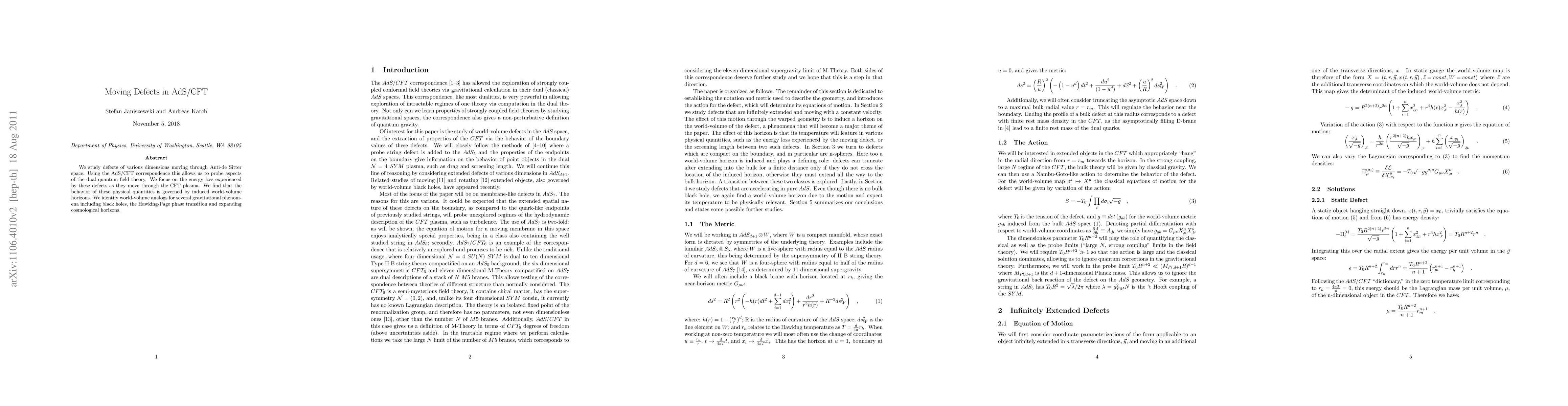 This research investigates moving defects in Anti-de Sitter (AdS) space and uses the AdS/CFT correspondence to explore their effects on dual quantum field theories, finding that induced world-volume horizons dictate their energy loss, with analogs for gravitational phenomena like black holes and cosmological horizons.