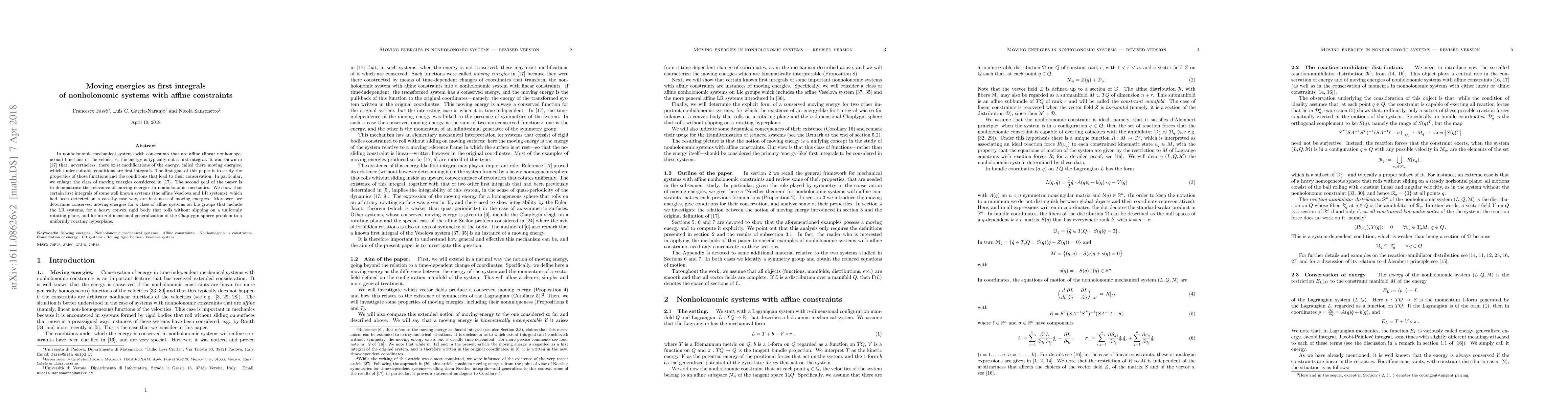 This paper investigates the properties of moving energies, which are modified forms of energy that act as first integrals in nonholonomic systems with affine velocity constraints. It extends the concept beyond the initial study and demonstrates their relevance in various mechanical systems, showing they are conserved under specific conditions.