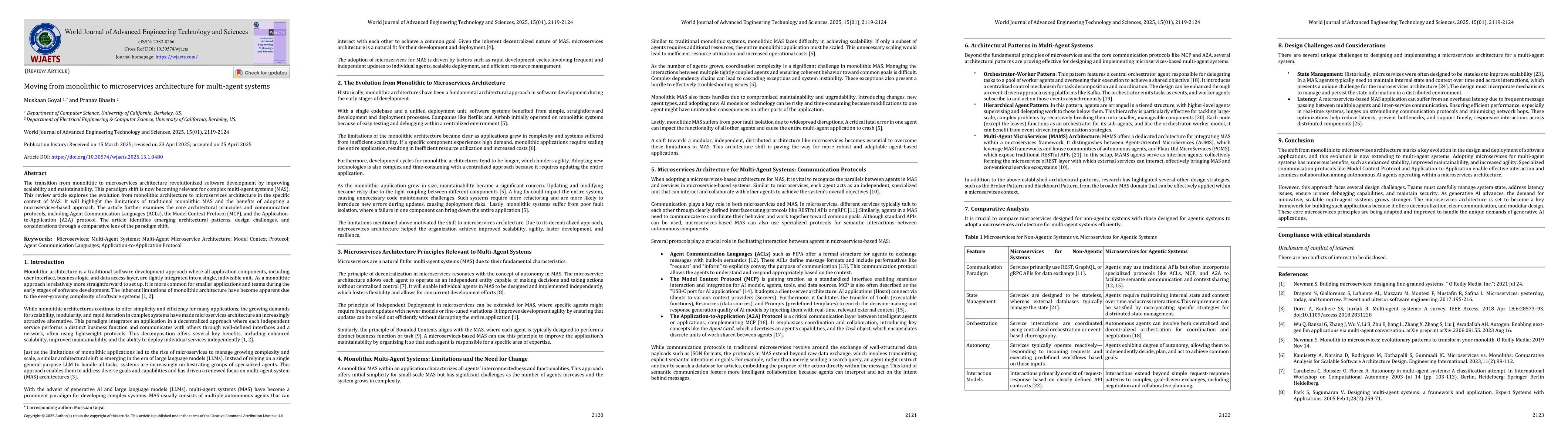 A review article explores the transition from monolithic to microservices architecture for multi-agent systems, highlighting its benefits and challenges, and identifies emerging architectural patterns and design considerations.