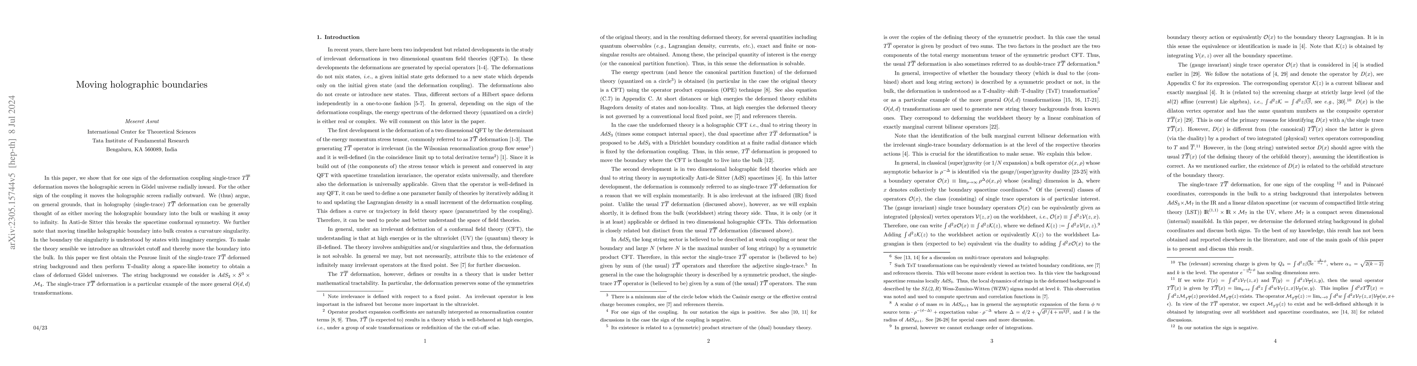 In this paper, we show that for one sign of the deformation coupling single-trace $T{\bar T}$ deformation moves the holographic screen in G\"{o}del universe radially inward. For the other sign of the coupling it moves the holographic screen radially outward. We (thus) argue, on general grounds, that in holography (single-trace) $T{\bar T}$ deformation can be generally thought of as either moving the holographic boundary into the bulk or washing it away to infinity. In Anti-de Sitter this breaks the spacetime conformal symmetry. We further note that moving timelike holographic boundary into bulk creates a curvature singularity. In the boundary the singularity is understood by states with imaginary energies. To make the theory sensible we introduce an ultraviolet cutoff and thereby move the boundary into the bulk. In this paper we first obtain the Penrose limit of the single-trace $T{\bar T}$ deformed string background and then perform $T$-duality along a space-like isometry to obtain a class of (deformed) G\"{o}del universes. The string background we consider is $AdS_3\times S^3\times {\cal M}_4$. The single-trace $T{\bar T}$ deformation is a particular example of the more general $O(d, d)$ transformations.