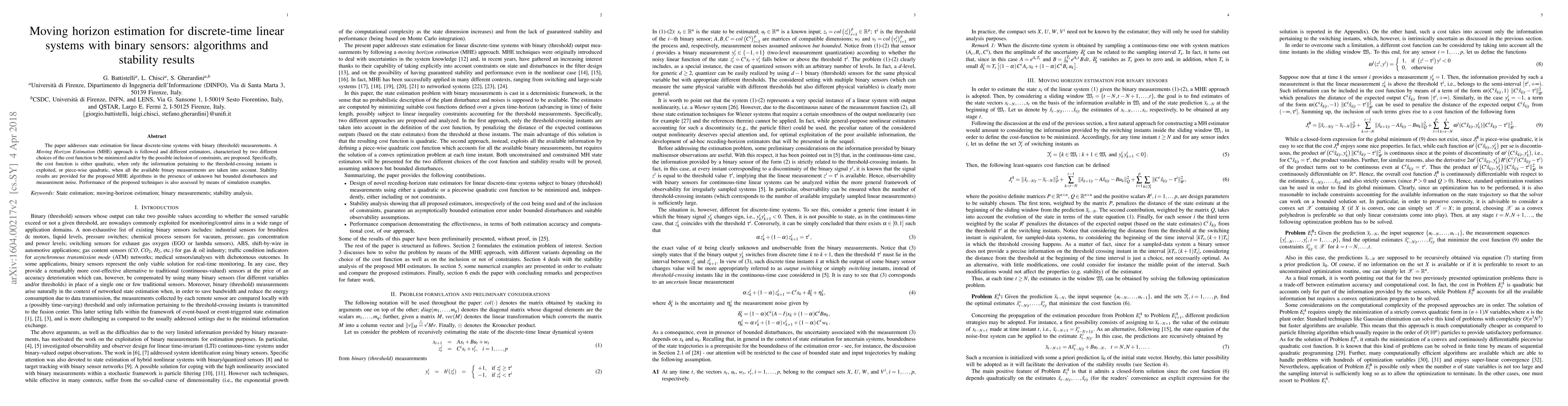 This paper proposes Moving Horizon Estimation (MHE) algorithms for state estimation in linear discrete-time systems with binary sensor measurements. It presents two cost functions—quadratic and piece-wise quadratic—and provides stability results for the proposed MHE methods under bounded disturbances and noise.