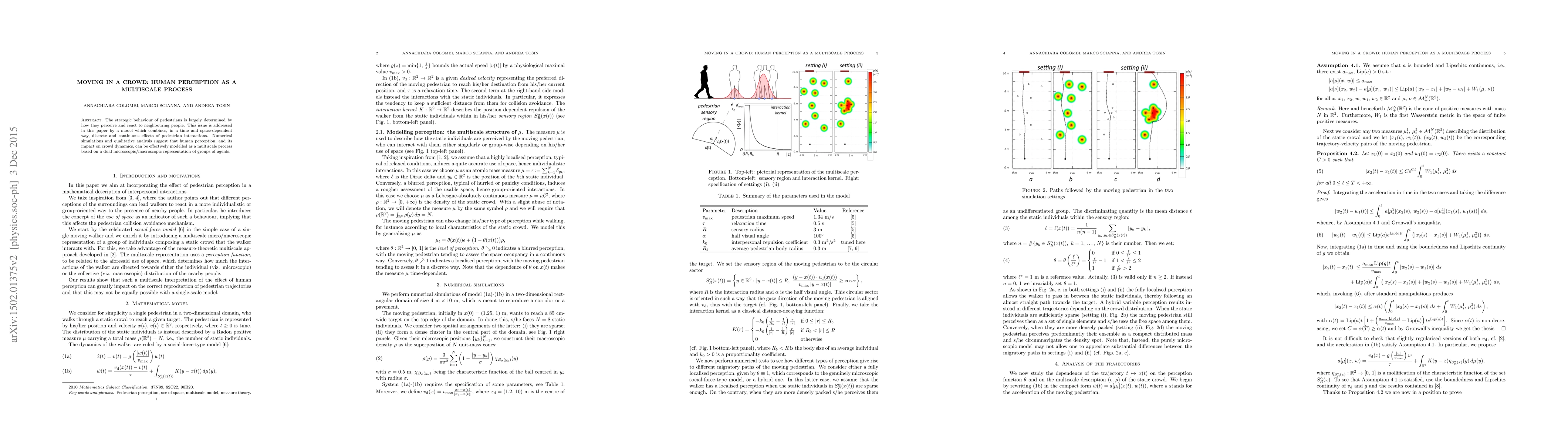 The strategic behaviour of pedestrians is largely determined by how they perceive and react to neighbouring people. This issue is addressed in this paper by a model which combines, in a time and space-dependent way, discrete and continuous effects of pedestrian interactions. Numerical simulations and qualitative analysis suggest that human perception, and its impact on crowd dynamics, can be effectively modelled as a multiscale process based on a dual microscopic/macroscopic representation of groups of agents.