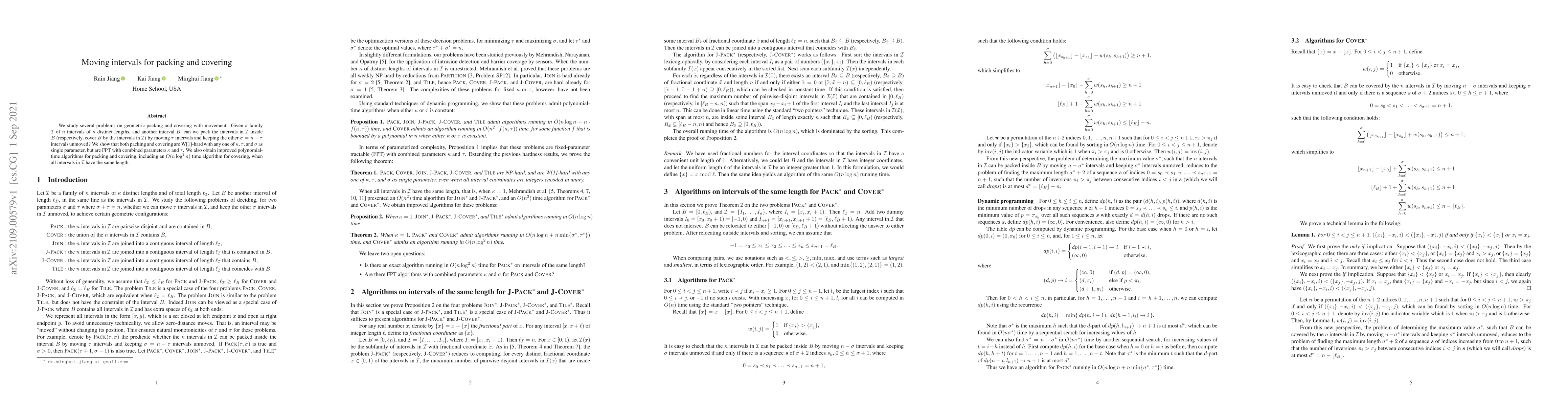 Summary: This paper investigates the complexity of packing and covering intervals within a given interval $B$ with limited movement of some intervals, proving both problems are W[1]-hard individually but FPT with combined parameters, and presenting improved polynomial-time algorithms for specific cases.