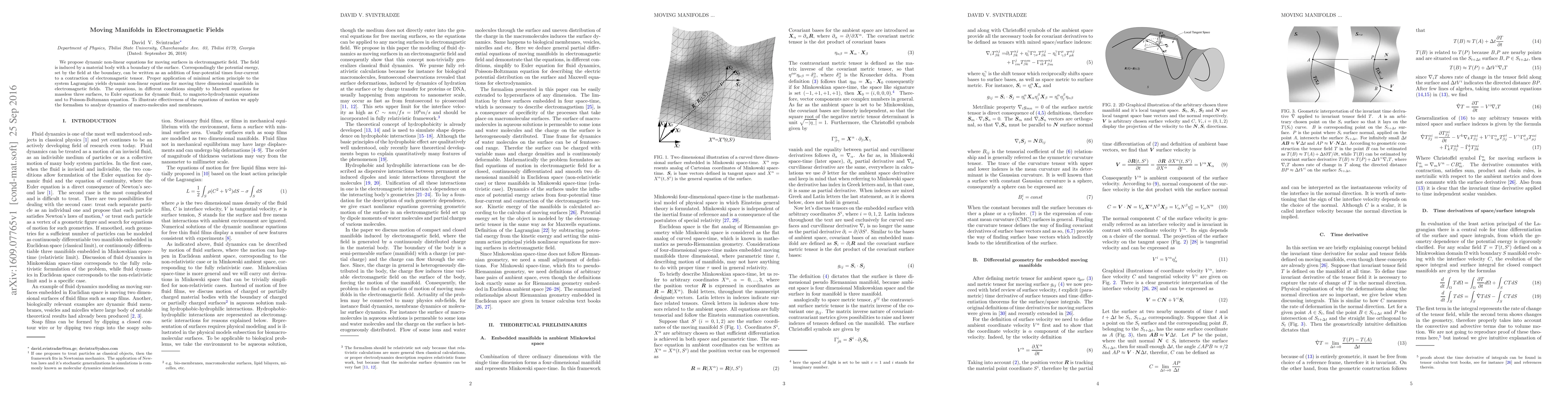 We propose dynamic non-linear equations for moving surfaces in electromagnetic field. The field is induced by a material body with a boundary of the surface. Correspondingly the potential energy, set by the field at the boundary, can be written as an addition of four-potential times four-current to a contraction of electromagnetic tensor. Proper application of minimal action principle to the system Lagrangian yields dynamic non-linear equations for moving three dimensional manifolds in electromagnetic fields. The equations, in different conditions simplify to Maxwell equations for massless three surfaces, to Euler equations for dynamic fluid, to magneto-hydrodynamic equations and to Poisson-Boltzmann equation. To illustrate effectiveness of the equations of motion we apply the formalism to analyze dynamics of macro-molecules and membranes.