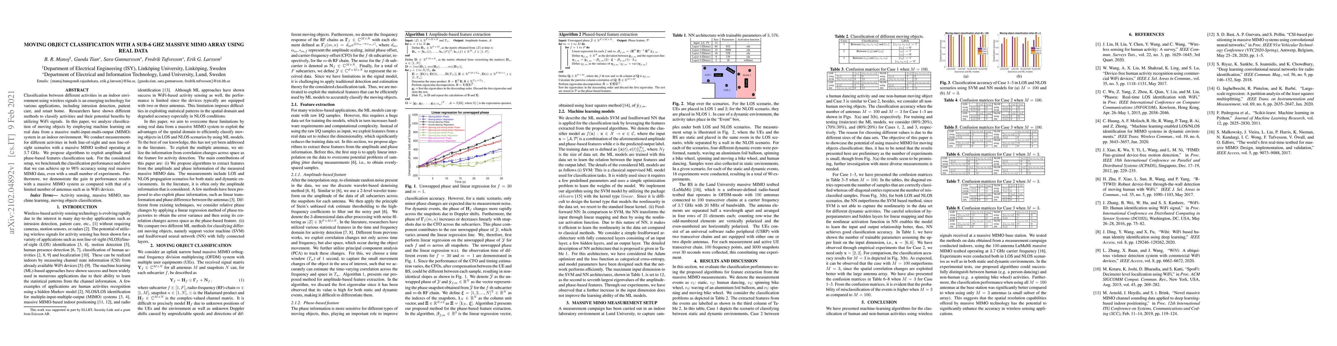 This paper explores the classification of moving objects in indoor environments using machine learning on real data from a sub-6 GHz massive MIMO system. The study achieves up to 98% accuracy in distinguishing activities, demonstrating significant performance gains over traditional WiFi devices.