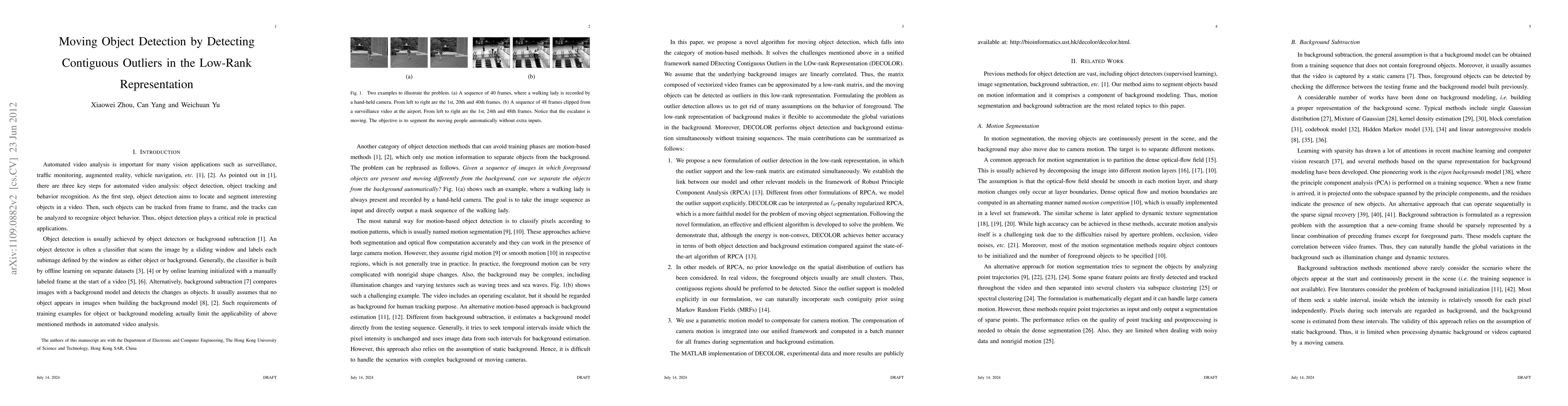 This paper proposes DECOLOR, a unified framework for moving object detection without a separate training phase, leveraging low-rank representation and contiguous outliers detection to handle complex scenarios like nonrigid motion and dynamic backgrounds. Experiments show DECOLOR outperforms existing methods on both simulated and real data.