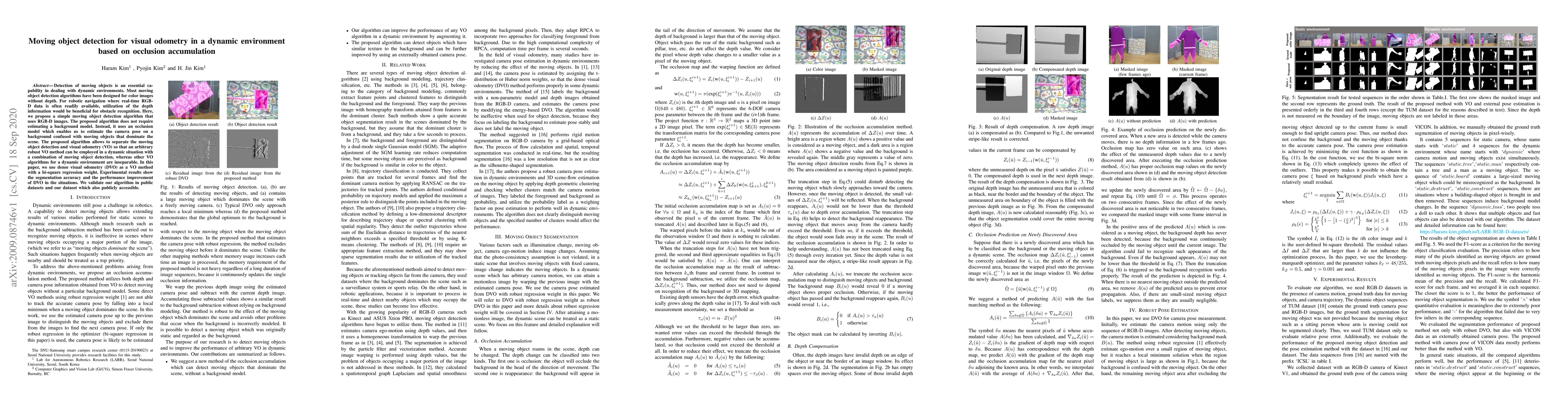 This paper proposes a moving object detection algorithm for RGB-D images that leverages occlusion accumulation instead of background modeling, enabling effective obstacle recognition. The method separates moving object detection from visual odometry, allowing for robust navigation in dynamic environments.
