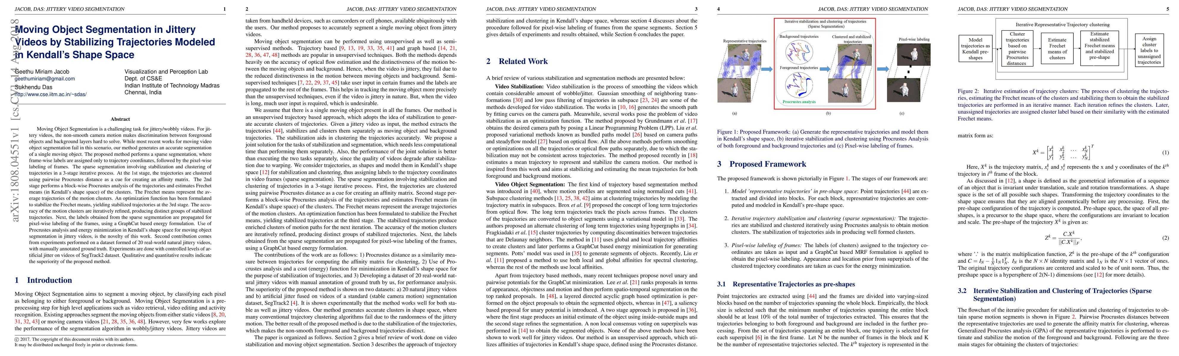 Moving Object Segmentation is a challenging task for jittery/wobbly videos. For jittery videos, the non-smooth camera motion makes discrimination between foreground objects and background layers hard to solve. While most recent works for moving video object segmentation fail in this scenario, our method generates an accurate segmentation of a single moving object. The proposed method performs a sparse segmentation, where frame-wise labels are assigned only to trajectory coordinates, followed by the pixel-wise labeling of frames. The sparse segmentation involving stabilization and clustering of trajectories in a 3-stage iterative process. At the 1st stage, the trajectories are clustered using pairwise Procrustes distance as a cue for creating an affinity matrix. The 2nd stage performs a block-wise Procrustes analysis of the trajectories and estimates Frechet means (in Kendall's shape space) of the clusters. The Frechet means represent the average trajectories of the motion clusters. An optimization function has been formulated to stabilize the Frechet means, yielding stabilized trajectories at the 3rd stage. The accuracy of the motion clusters are iteratively refined, producing distinct groups of stabilized trajectories. Next, the labels obtained from the sparse segmentation are propagated for pixel-wise labeling of the frames, using a GraphCut based energy formulation. Use of Procrustes analysis and energy minimization in Kendall's shape space for moving object segmentation in jittery videos, is the novelty of this work. Second contribution comes from experiments performed on a dataset formed of 20 real-world natural jittery videos, with manually annotated ground truth. Experiments are done with controlled levels of artificial jitter on videos of SegTrack2 dataset. Qualitative and quantitative results indicate the superiority of the proposed method.
