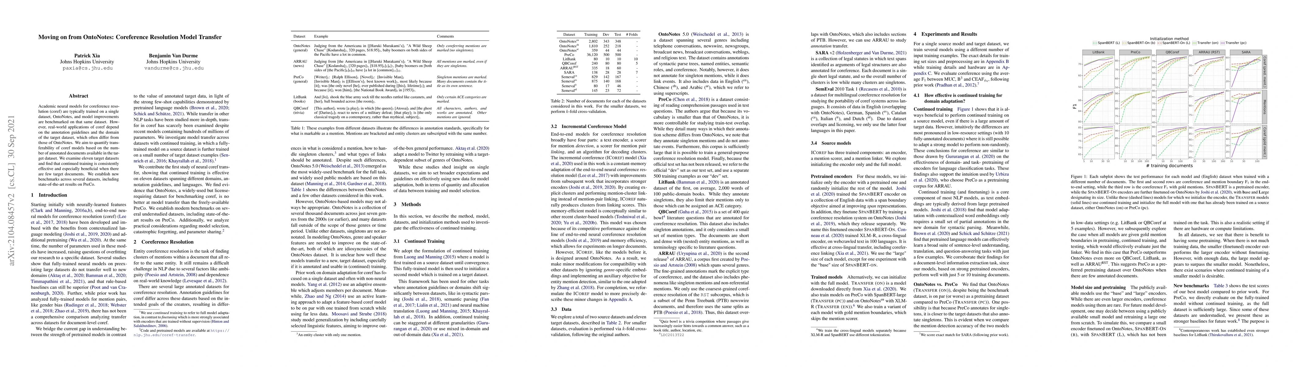 This paper investigates the transferability of coreference resolution models trained on OntoNotes, finding that continued training on target datasets significantly improves performance, especially when few annotated documents are available. New benchmarks are established, achieving state-of-the-art results on PreCo.