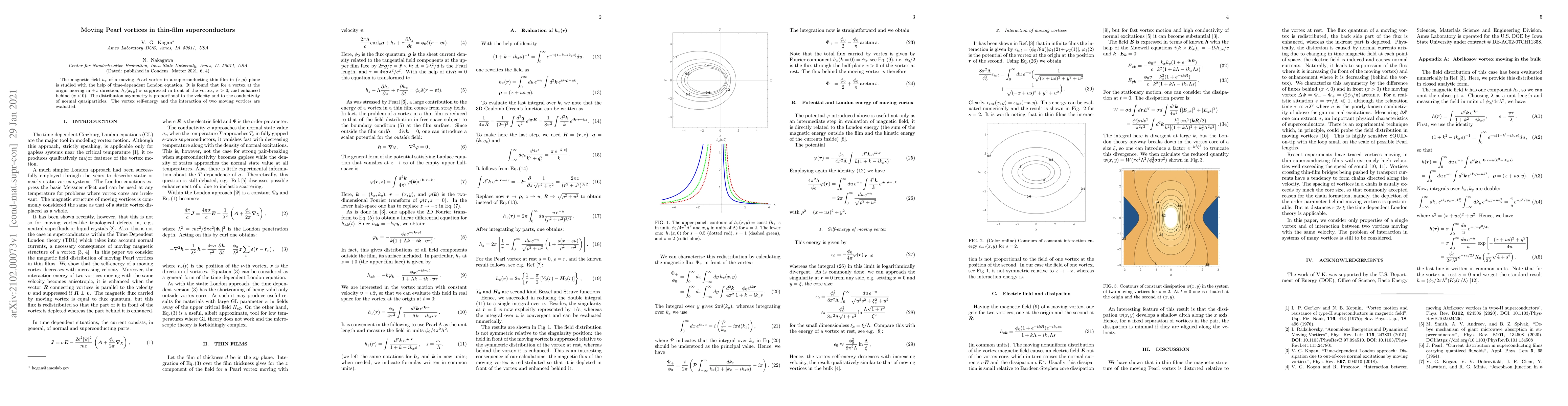 The magnetic field $h_z$ of a moving Pearl vortex in a superconducting thin-film in $(x,y)$ plane is studied with the help of time-dependent London equation. It is found that for a vortex at the origin moving in $+x$ direction, $h_z(x,y)$ is suppressed in front of the vortex, $x>0$, and enhanced behind ($x<0$). The distribution asymmetry is proportional to the velocity and to the conductivity of normal quasiparticles. The vortex self-energy and the interaction of two moving vortices are evaluated.