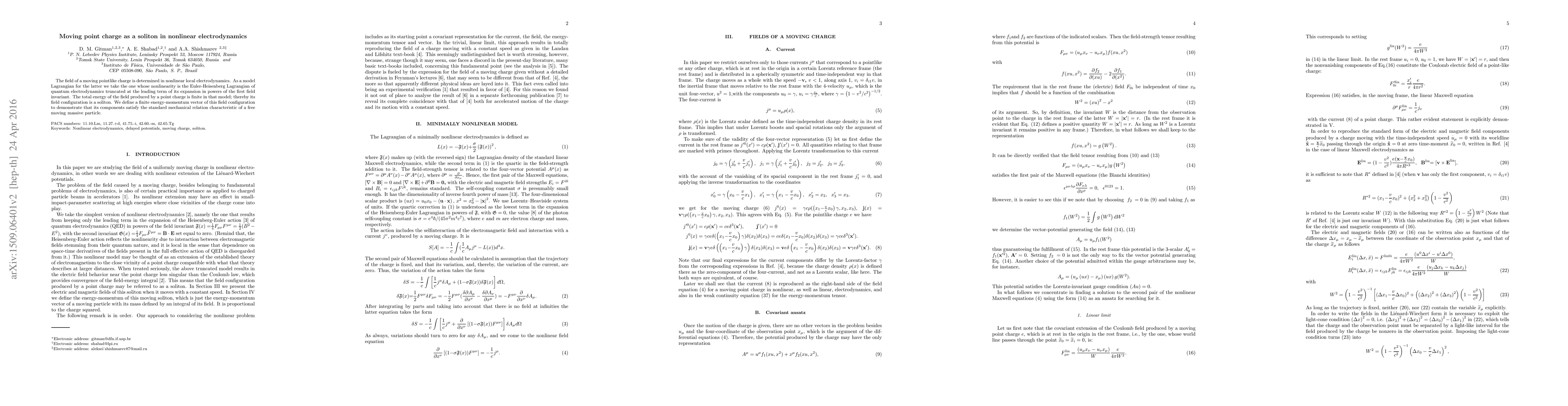 This paper investigates the field of a moving point charge within nonlinear electrodynamics, using the Euler-Heisenberg Lagrangian as a model. It demonstrates that the field configuration forms a soliton with finite energy, and defines an energy-momentum vector that adheres to the standard mechanical relation for a free moving particle.
