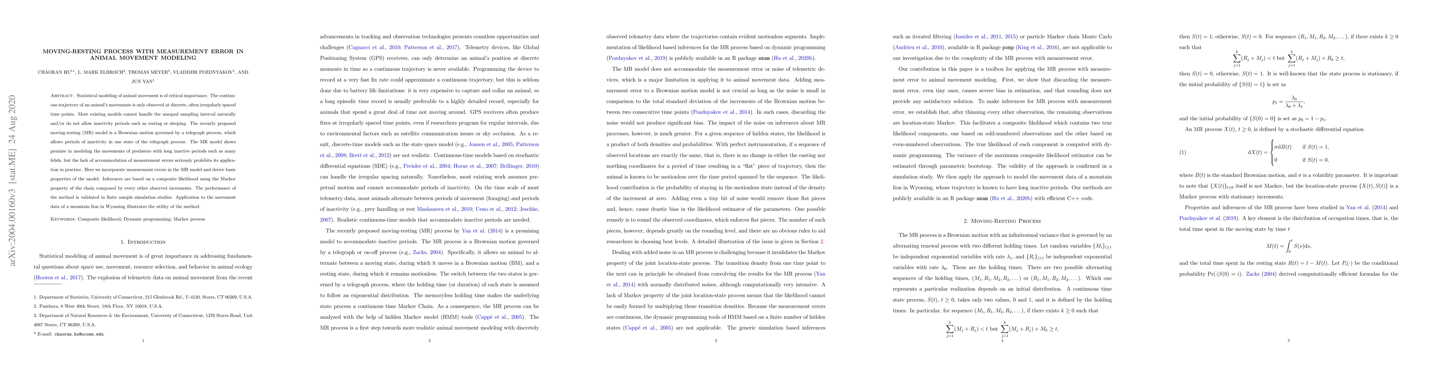 A new statistical model incorporating measurement errors is proposed to analyze animal movement, addressing a key limitation of existing models that cannot handle unequal sampling intervals or inactivity periods.