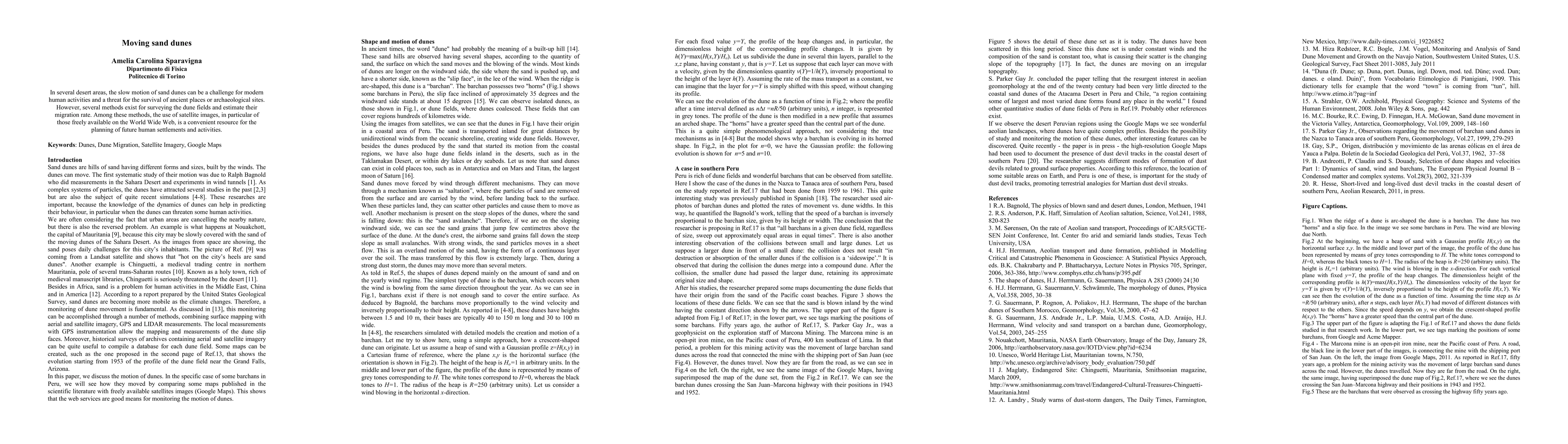 In several desert areas, the slow motion of sand dunes can be a challenge for modern human activities and a threat for the survival of ancient places or archaeological sites. However, several methods exist for surveying the dune fields and estimate their migration rate. Among these methods, the use of satellite images, in particular of those freely available on the World Wide Web, is a convenient resource for the planning of future human settlements and activities.