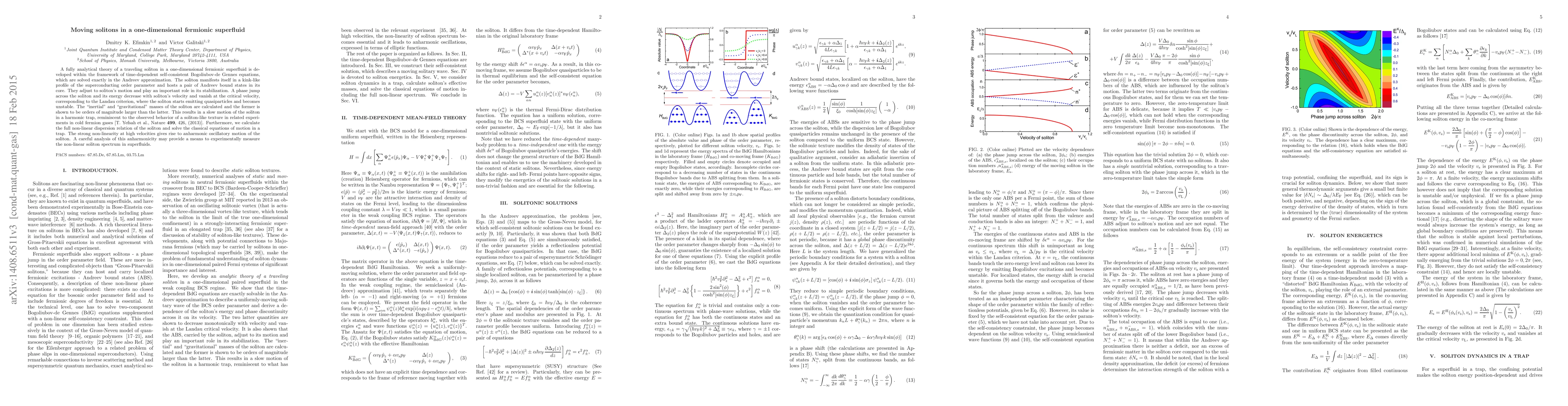 This paper develops an analytical theory for traveling solitons in one-dimensional fermionic superfluids, showing they stabilize via Andreev bound states and exhibit a phase jump and energy decrease with velocity. The soliton's "inertial" mass is much larger than its "gravitational" mass, leading to slow motion in a harmonic trap, consistent with experimental observations in cold fermion gases.